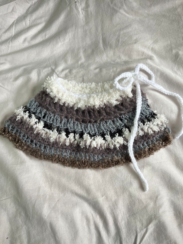 〈ミニ ラップスカート エプロン つけ襟〉 モノトーンのボーダー柄ミニラップスカート。 もこもこのループの毛糸やモヘアなど いろんな素材が混ざっており、 シンプルなカラーでも飽きないデザインに。 ワンピースに合わせたり、スウェットに重ねたり、どんなお洋服にも使えるアイテムです。 ちょっと物足りない時や気分を変えたい時にぴったり◎ 腰に巻くだけじゃなく、斜め掛けや つけ襟のようにするのもおすすめ! いろんな使い方で楽しめます♪ ⚫︎サイズ 21cm ×ウエスト52cm 裾90cm 紐 58cm ⚫︎素材 アクリル/ポリエステル/ウール/モヘア/アルパカ ⚫︎手入れ方法 水またはぬるま湯におしゃれ着用の中性洗剤を入れ、優しく押し洗いしてください。(熱いお湯で洗うと縮む可能性があります。また、洗いとすすぎの温度の変化でも縮む可能性があるため水温に注意してください。) 形を整えて、日陰で平干ししてください。 *POP UPに出品していたため、メンテナンスを行い掲載しております *ひとつひとつ丁寧に製作しておりますが、全て手編みの為、多少の目のばらつきやサイズに誤差が生じる場合がございます。 ハンドメイド作品であることにご理解の上ご購入お願いいたします。