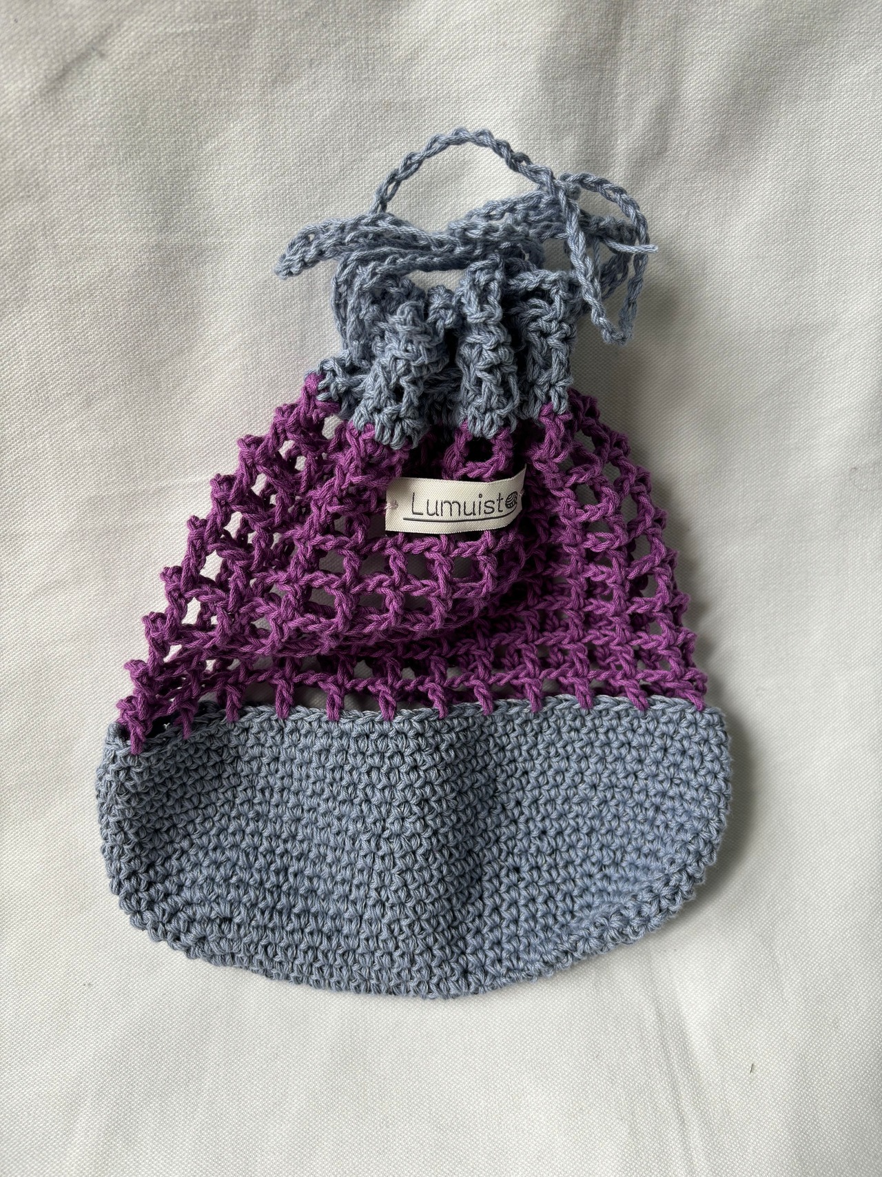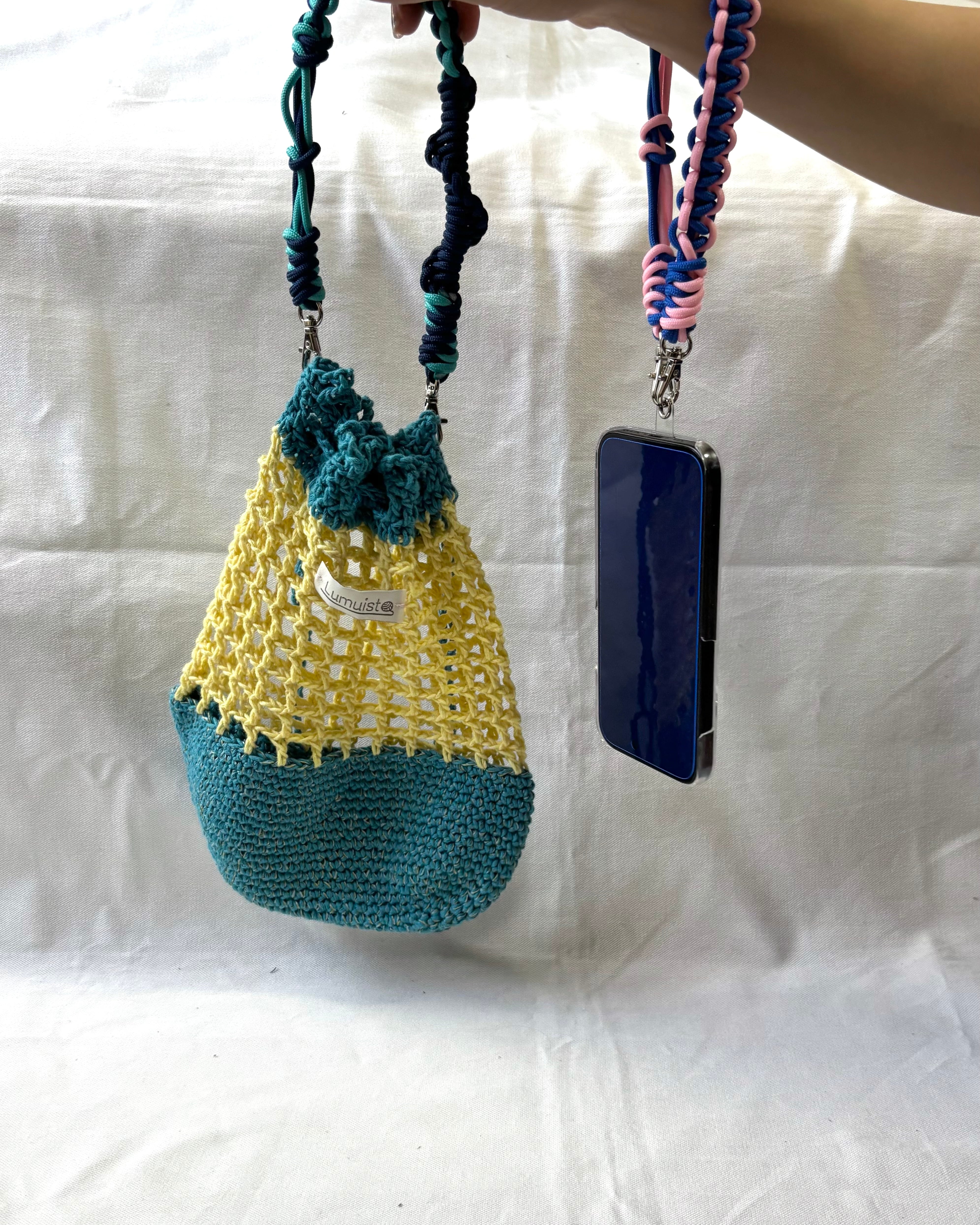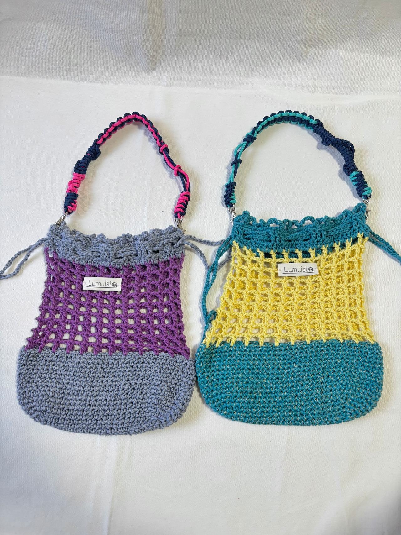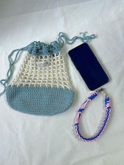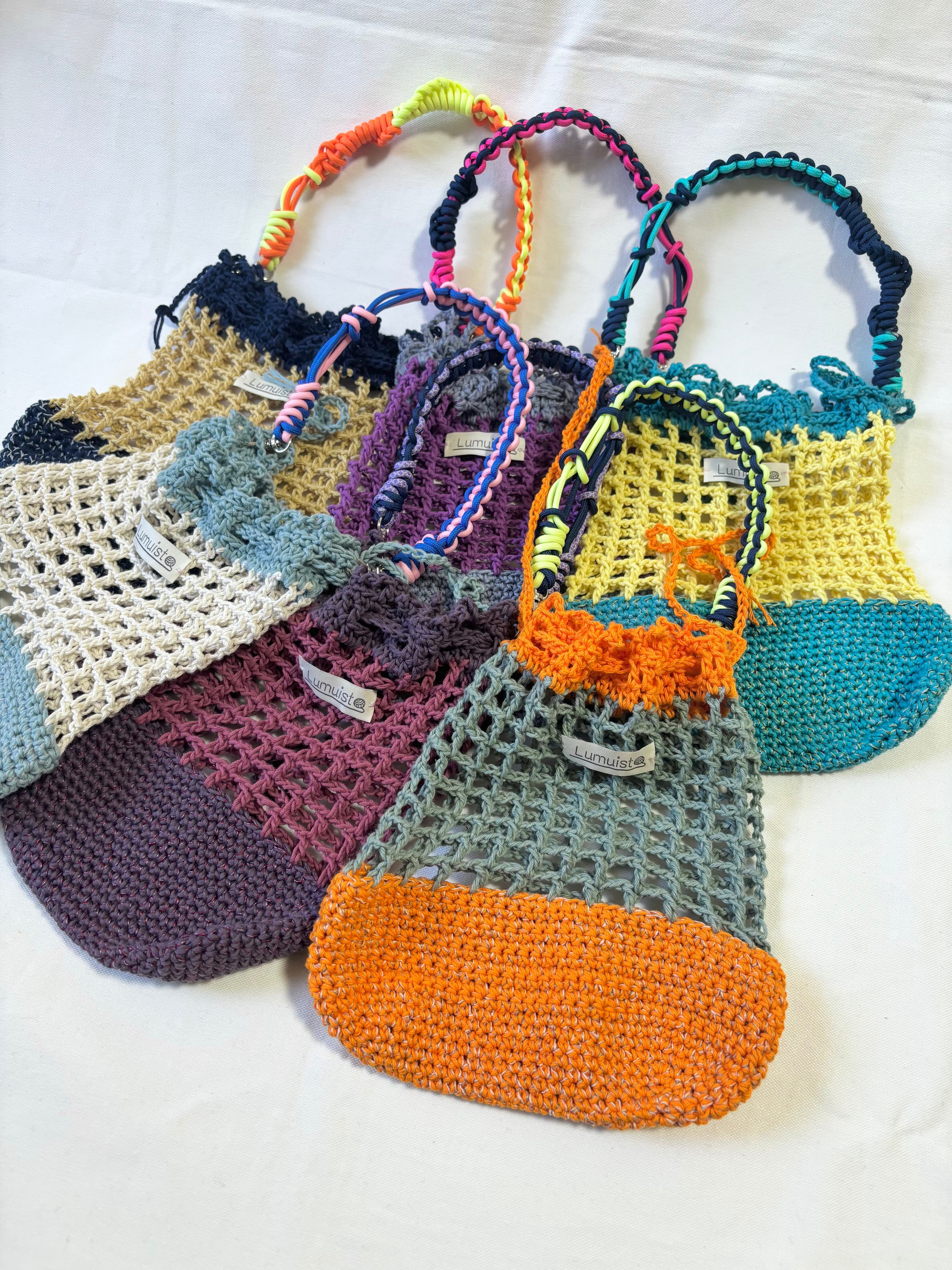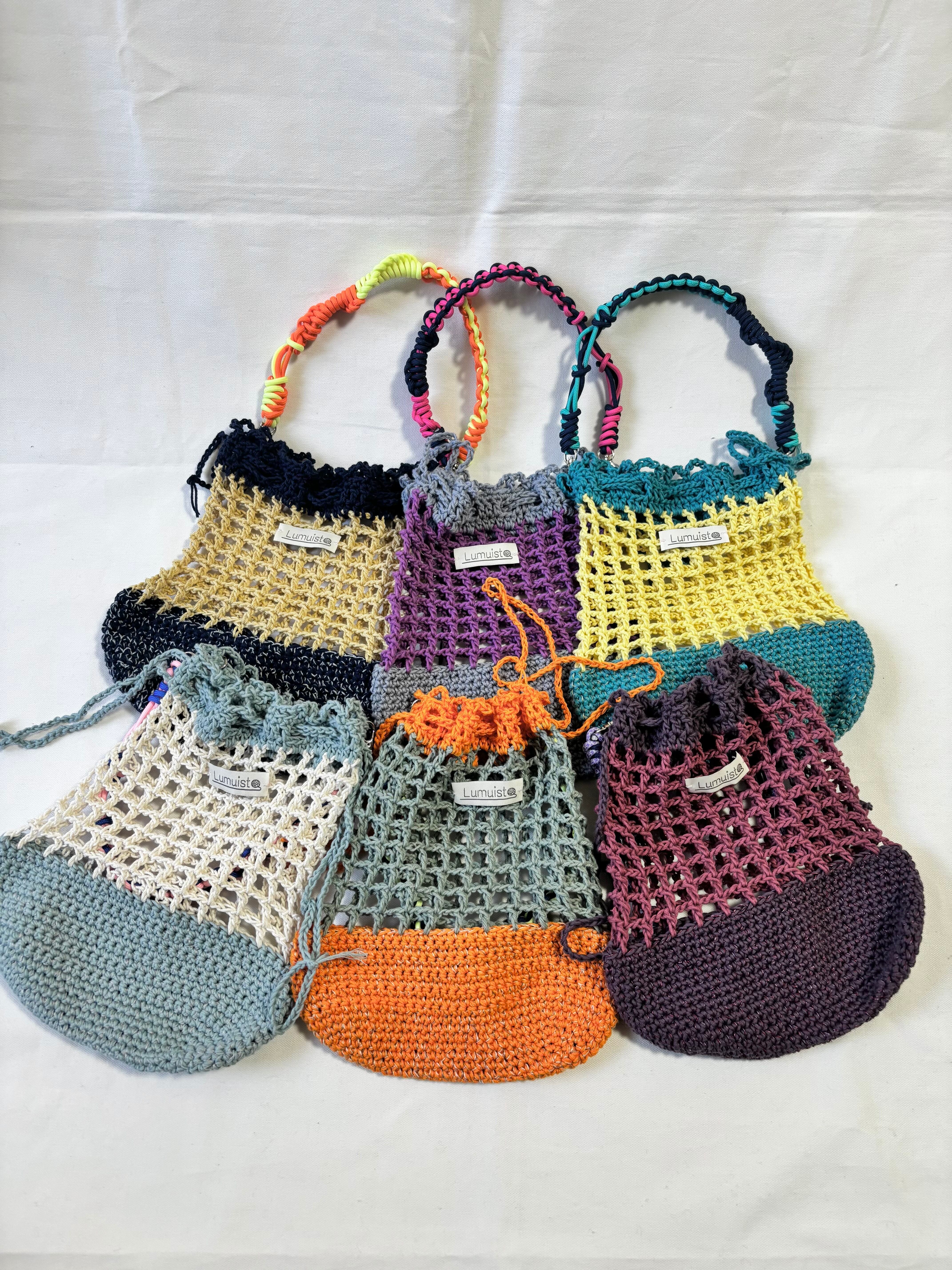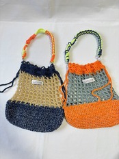 カラフルなメッシュ編み巾着。