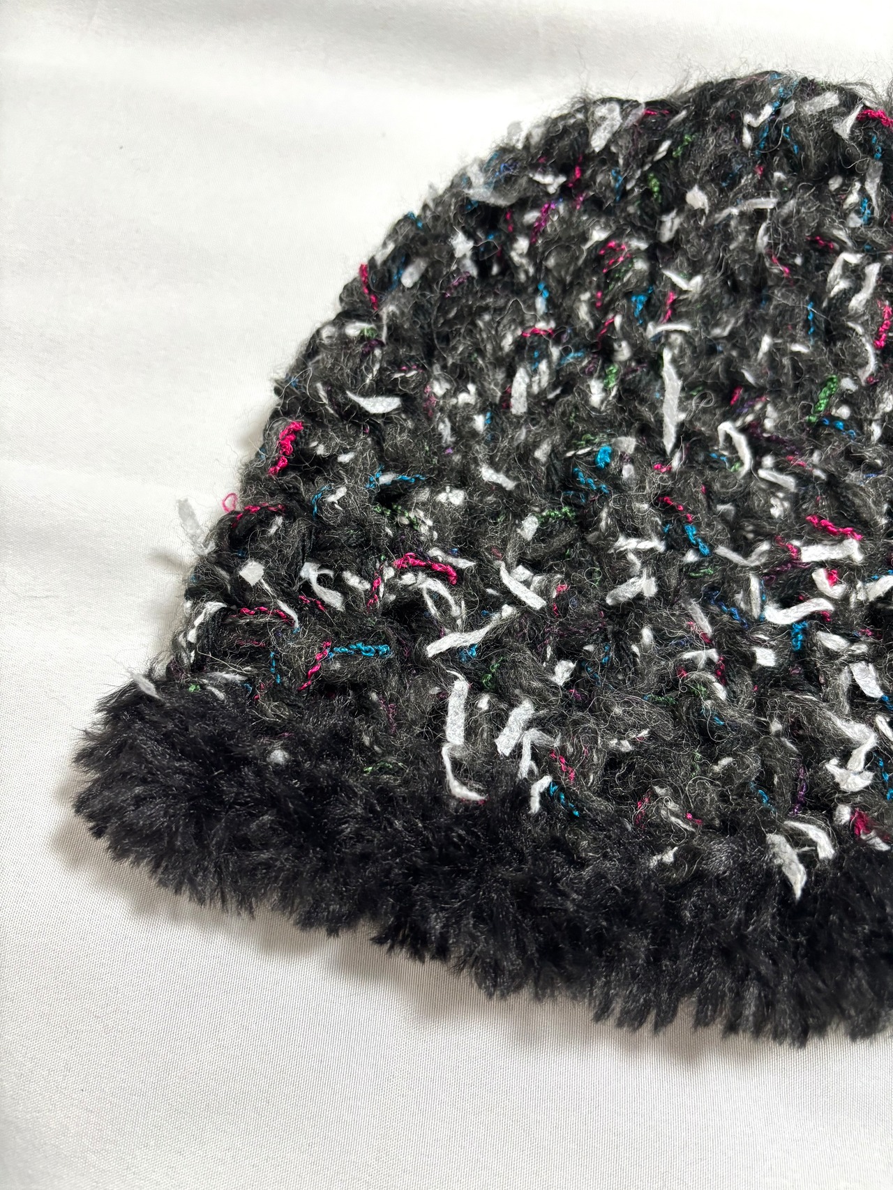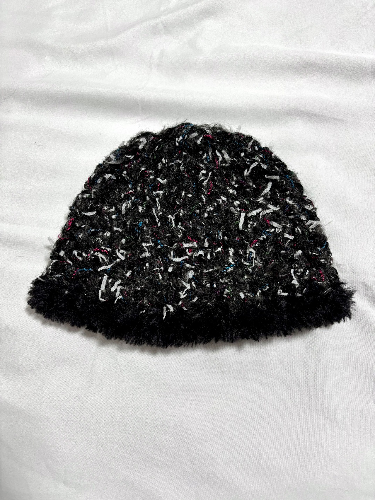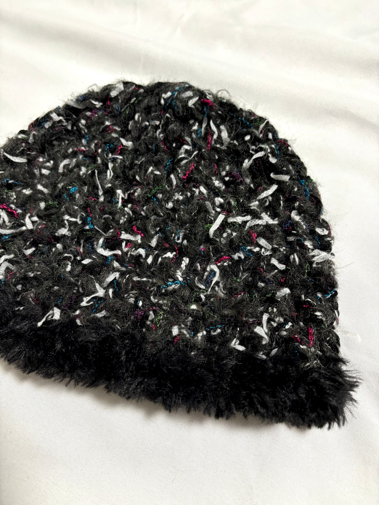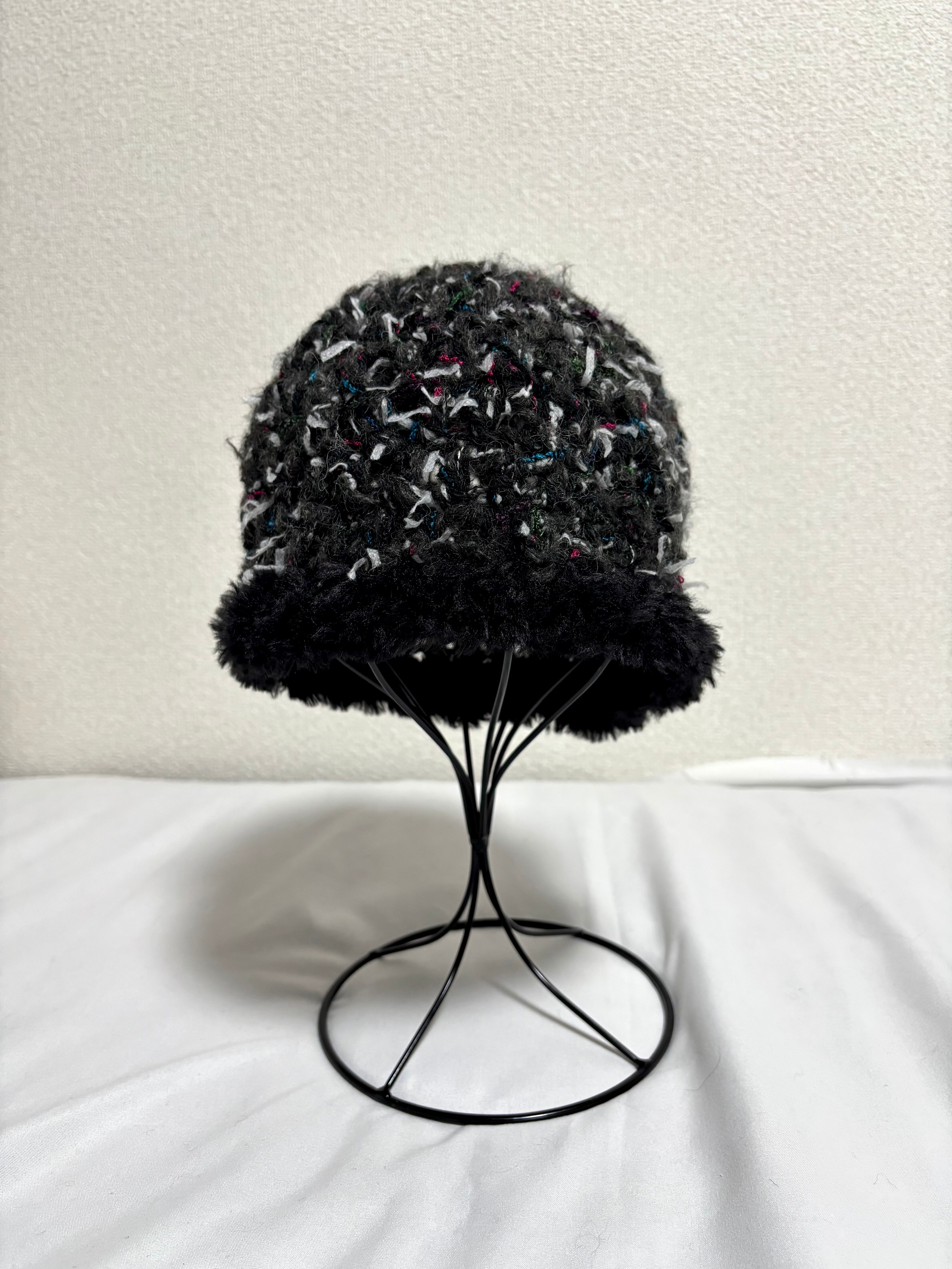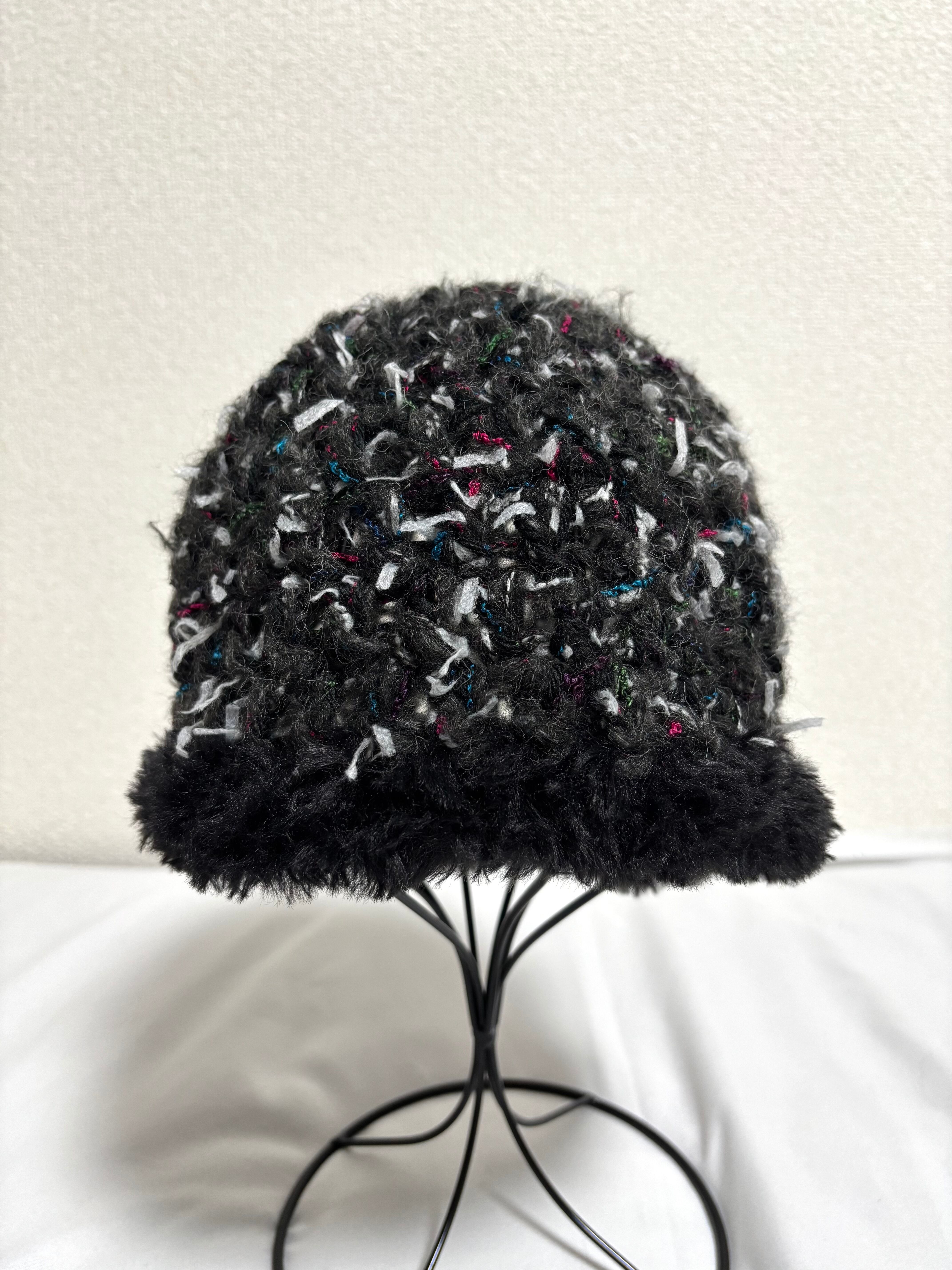 黒ベースにカラフルな糸やファンシーヤーンを合わせて編んだニット帽。