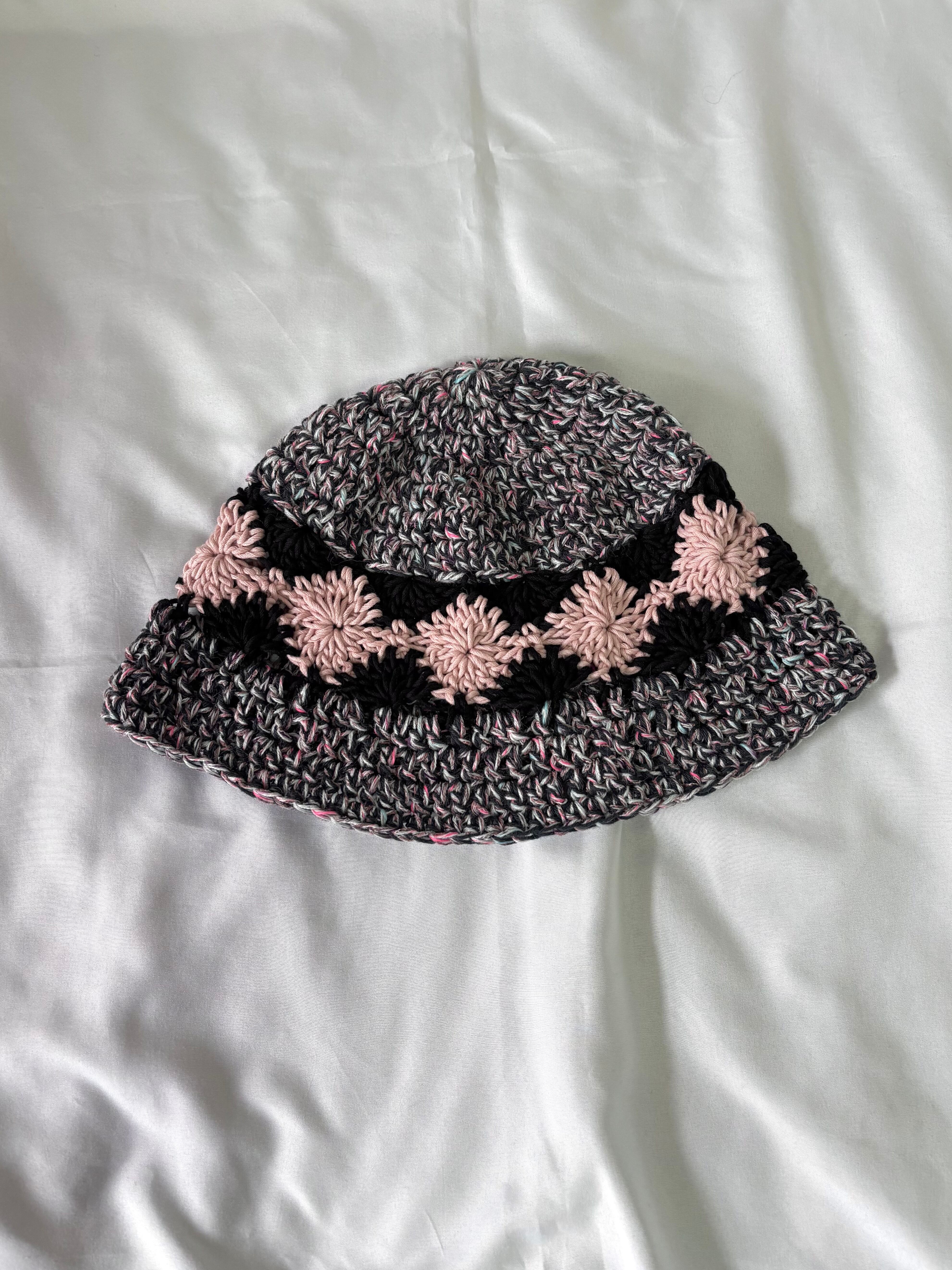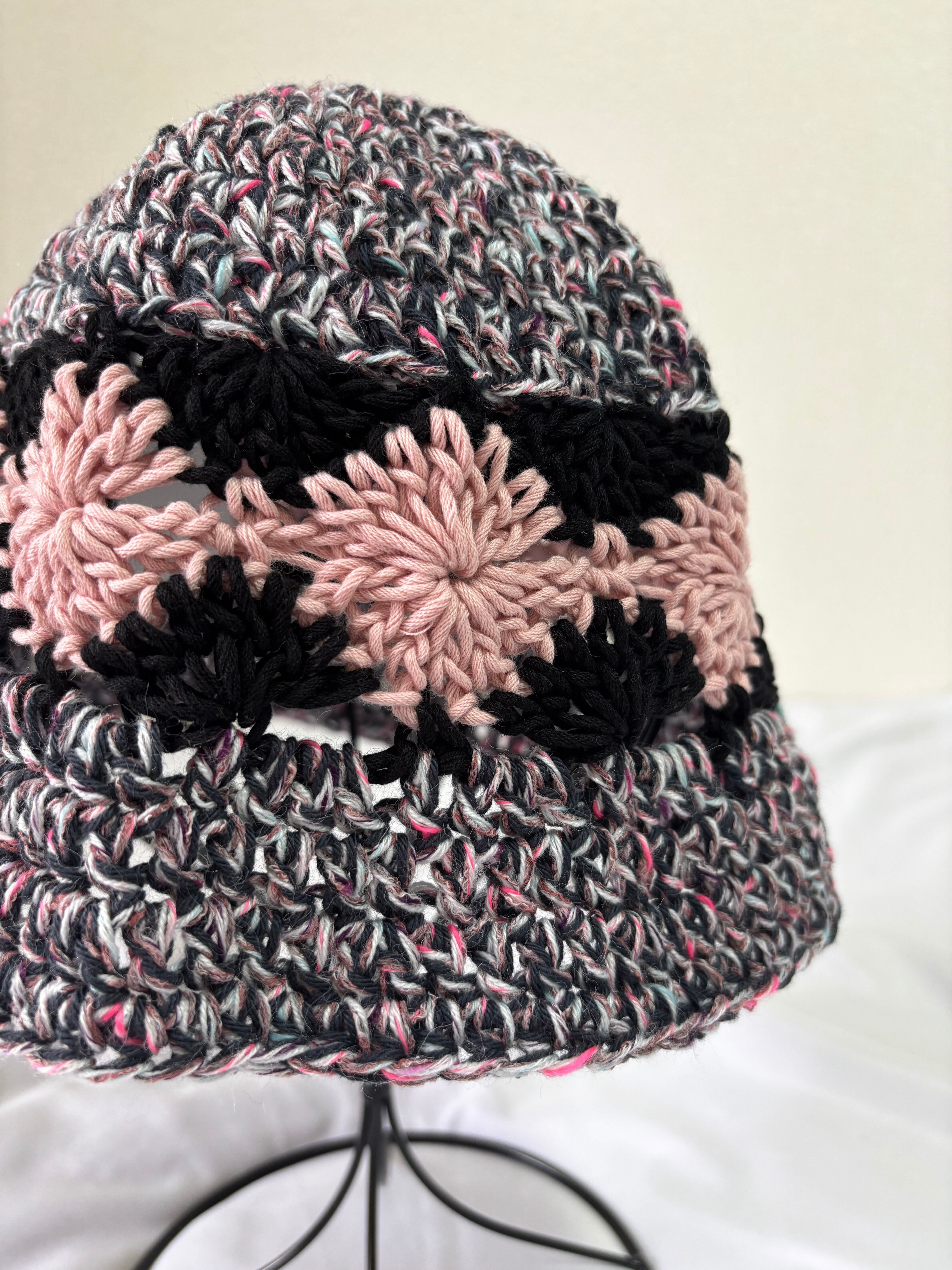 ブラック×ピンクの模様が目を惹くクロシェハット。