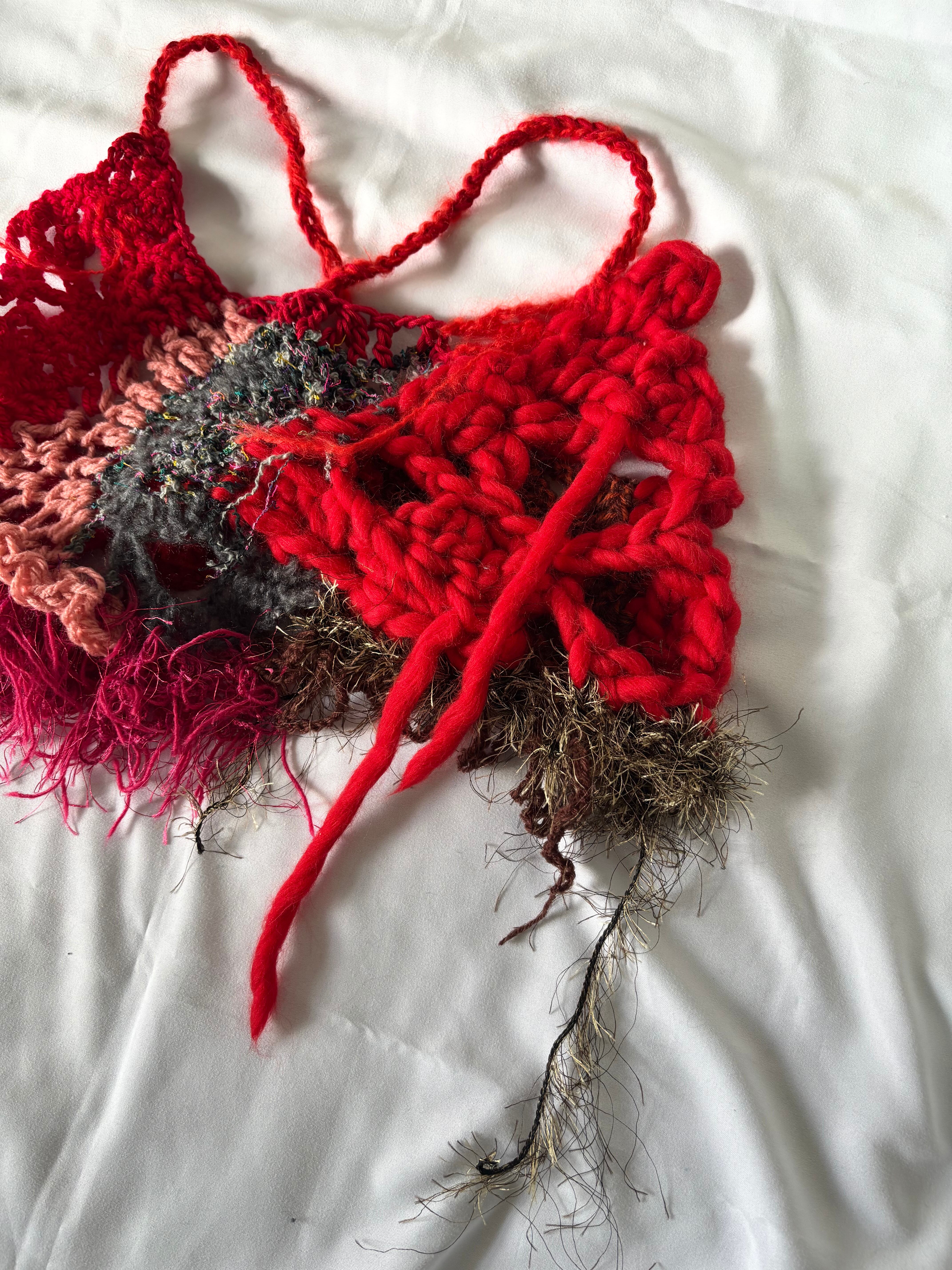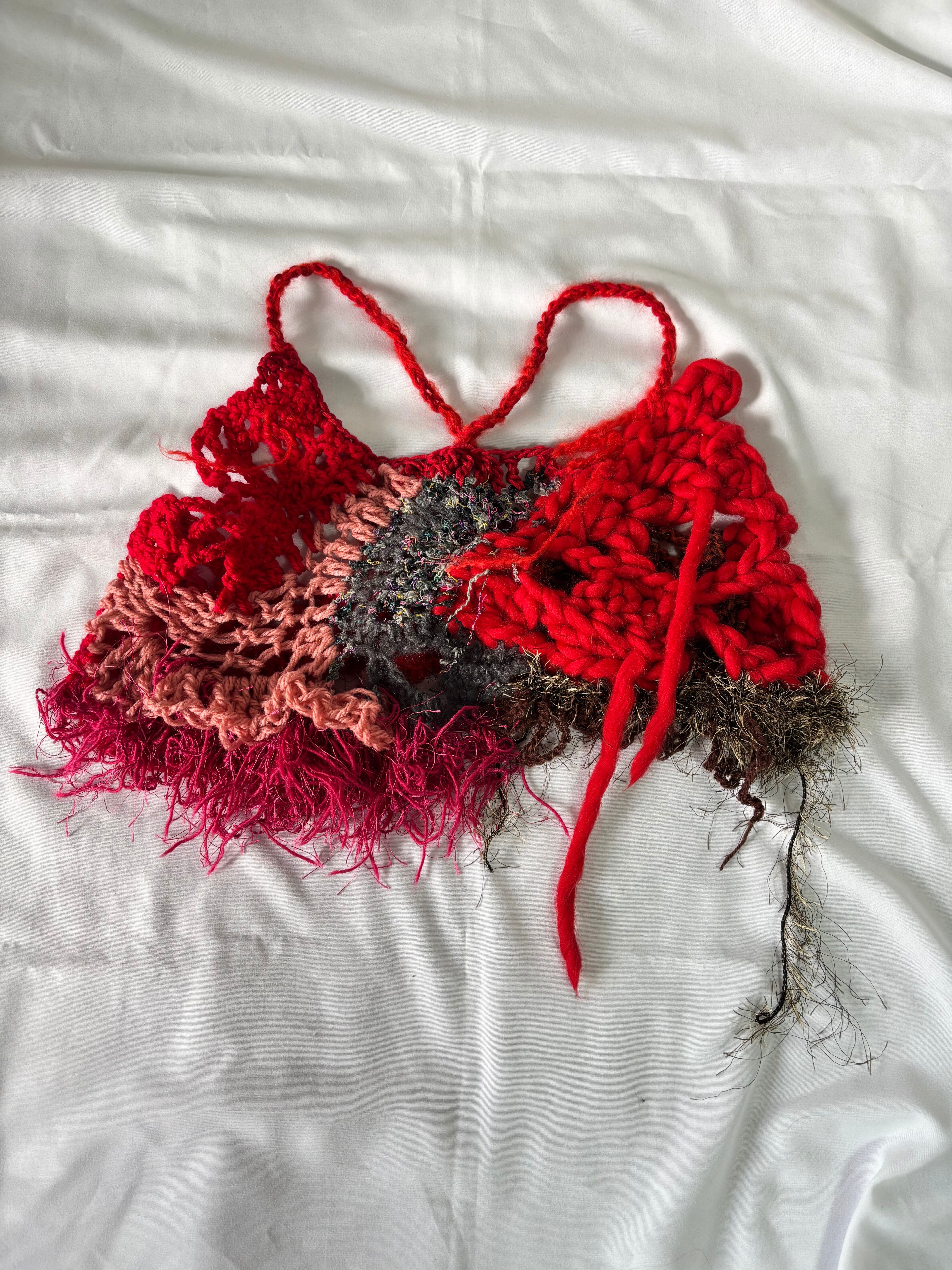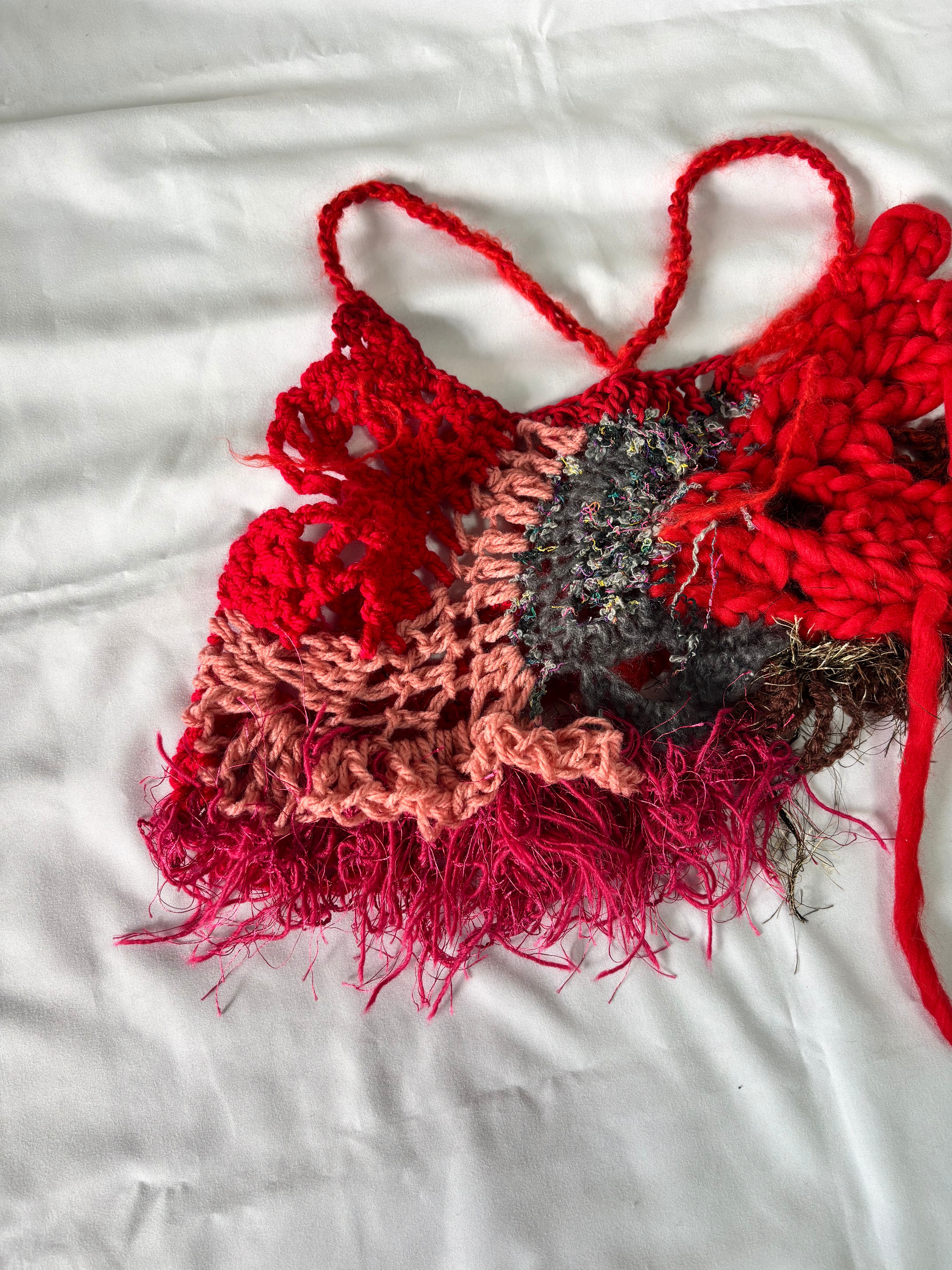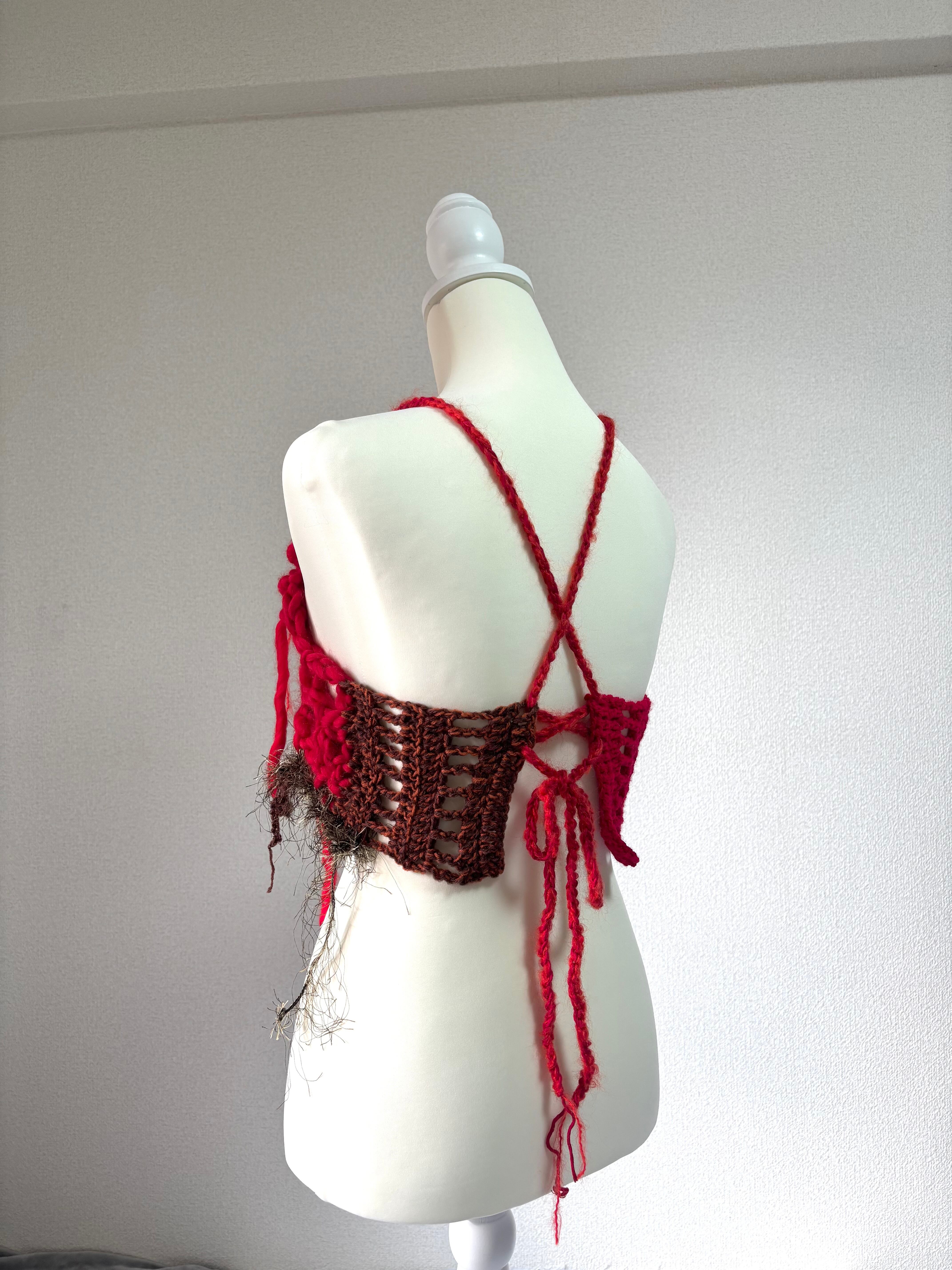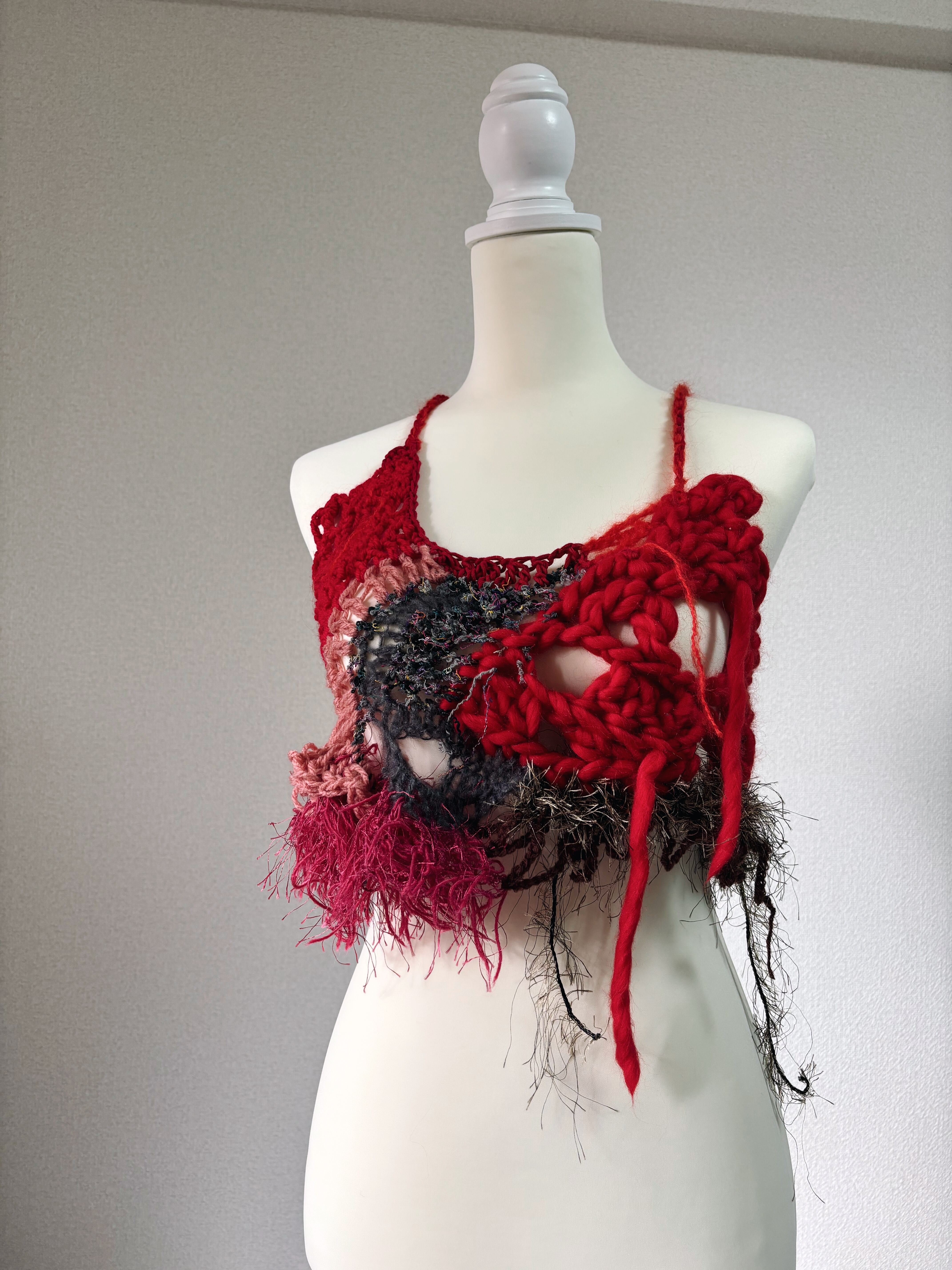 様々な素材の毛糸をランダムに編んだビスチェ。