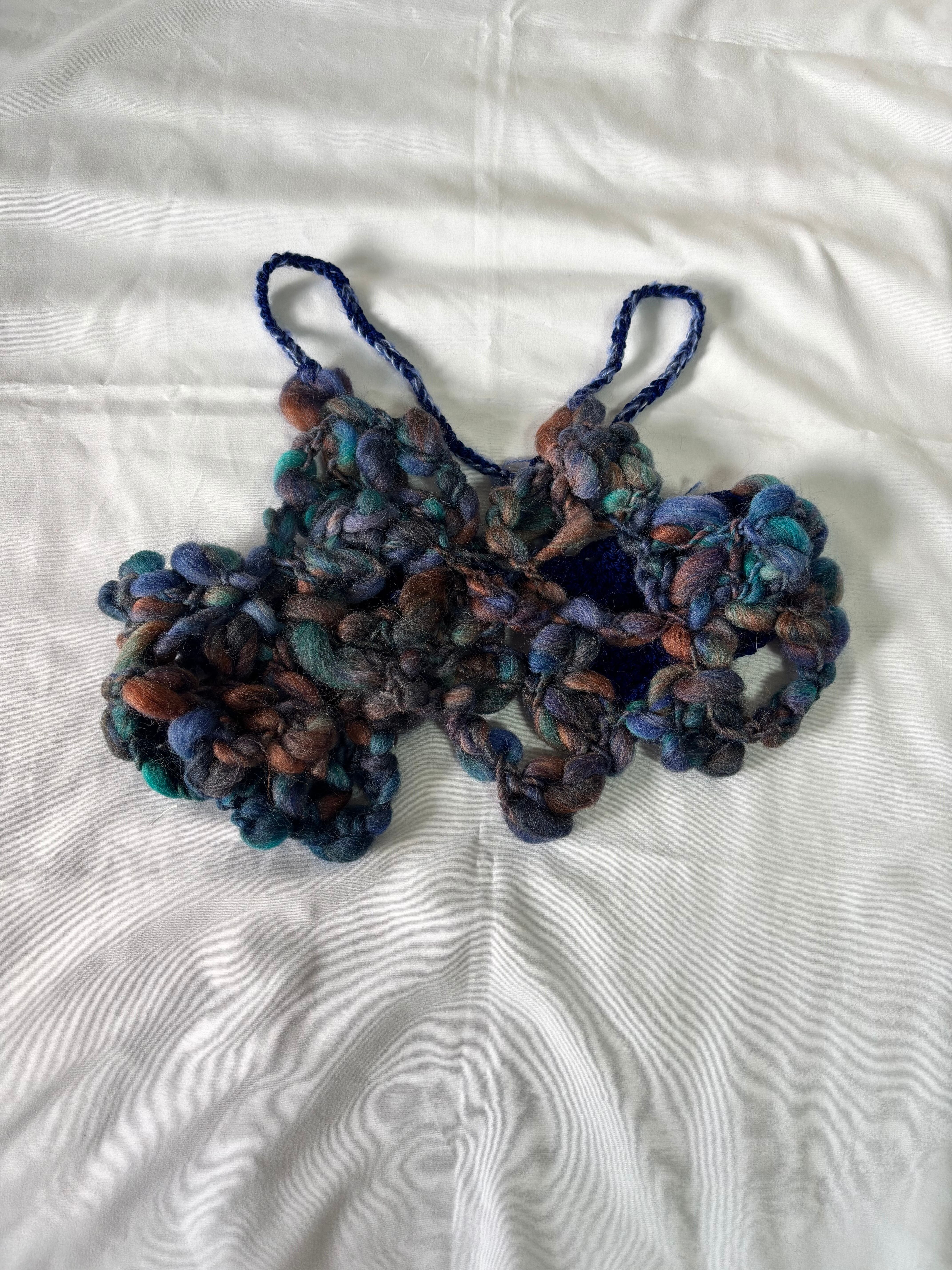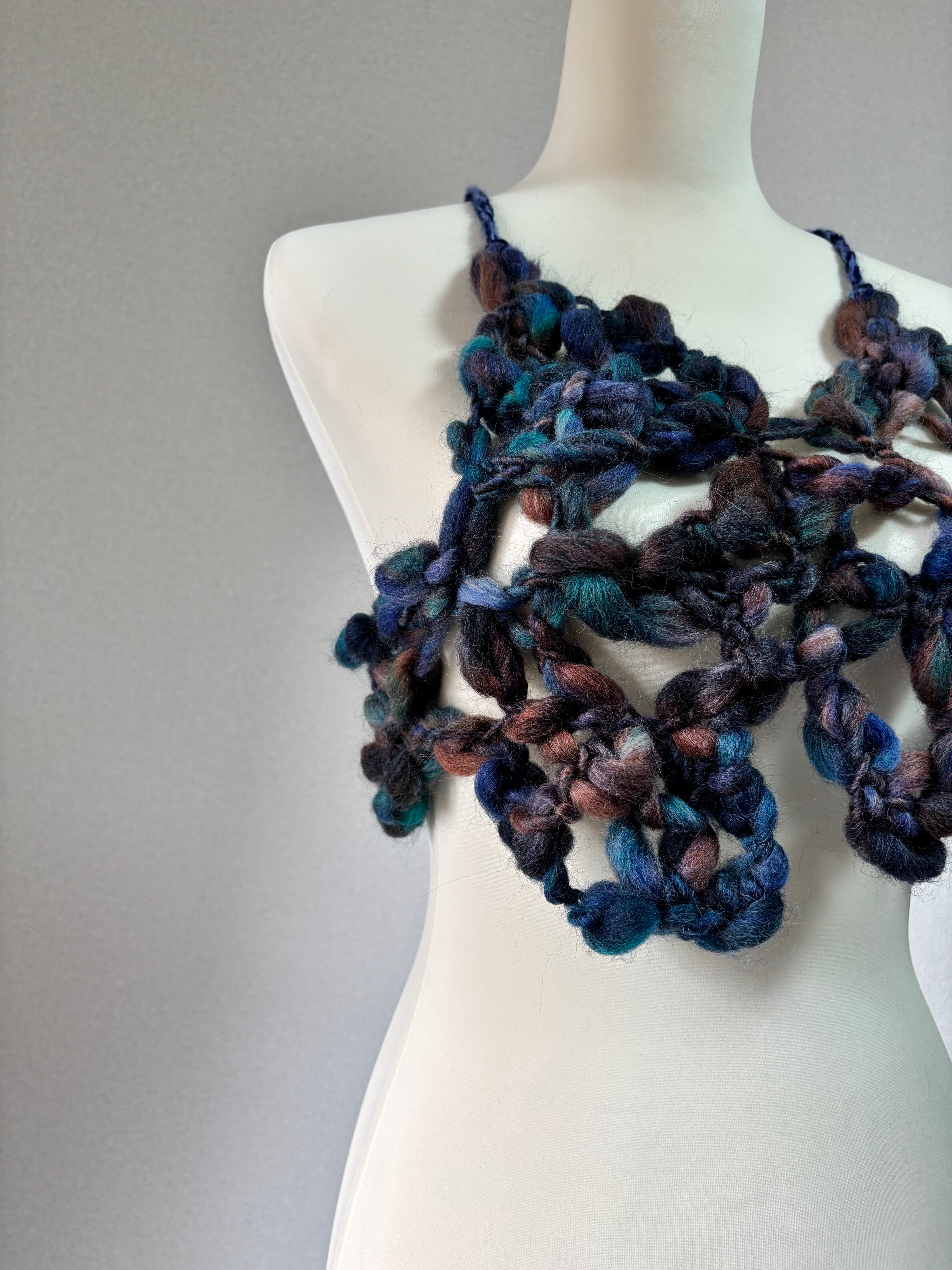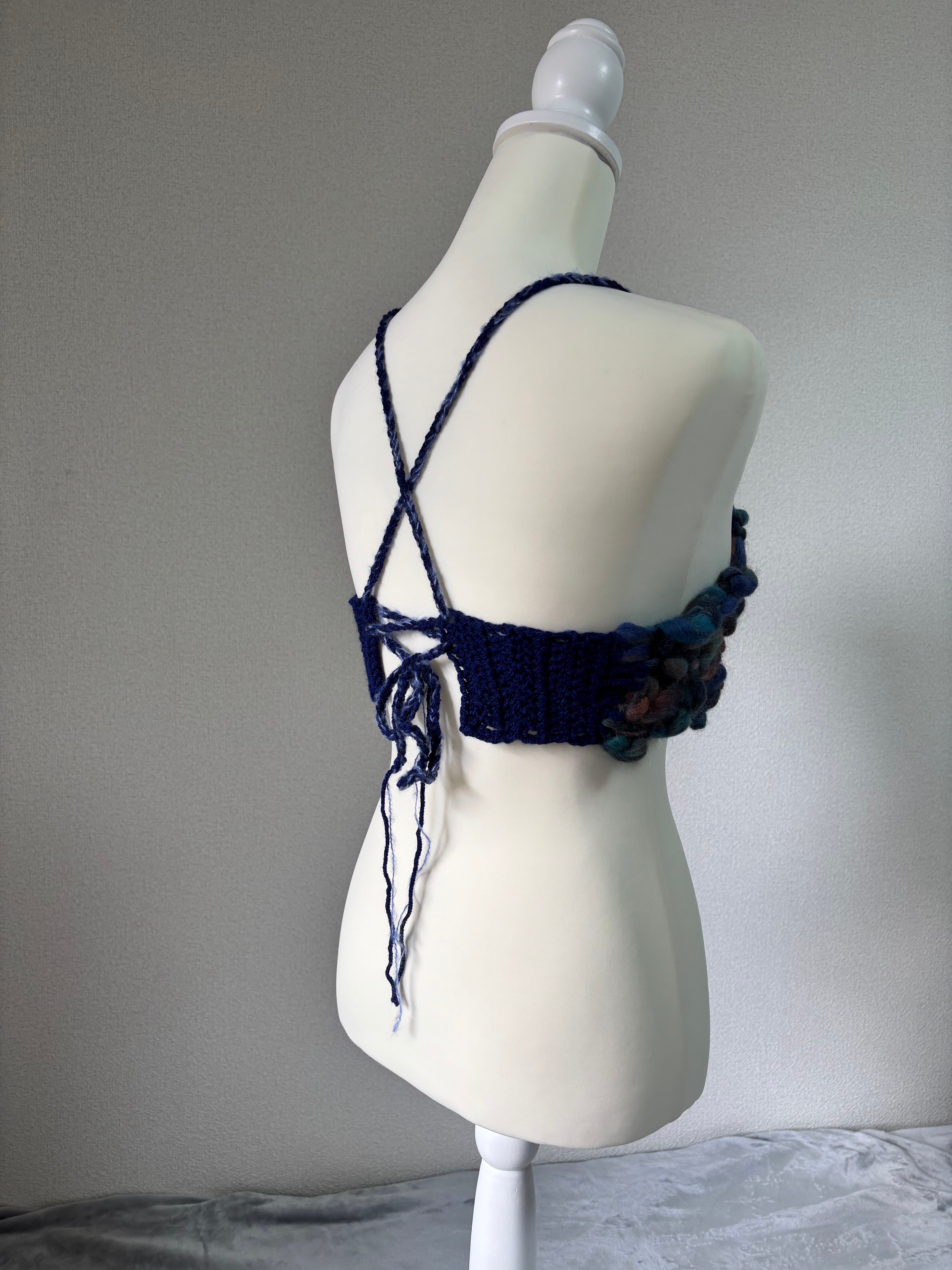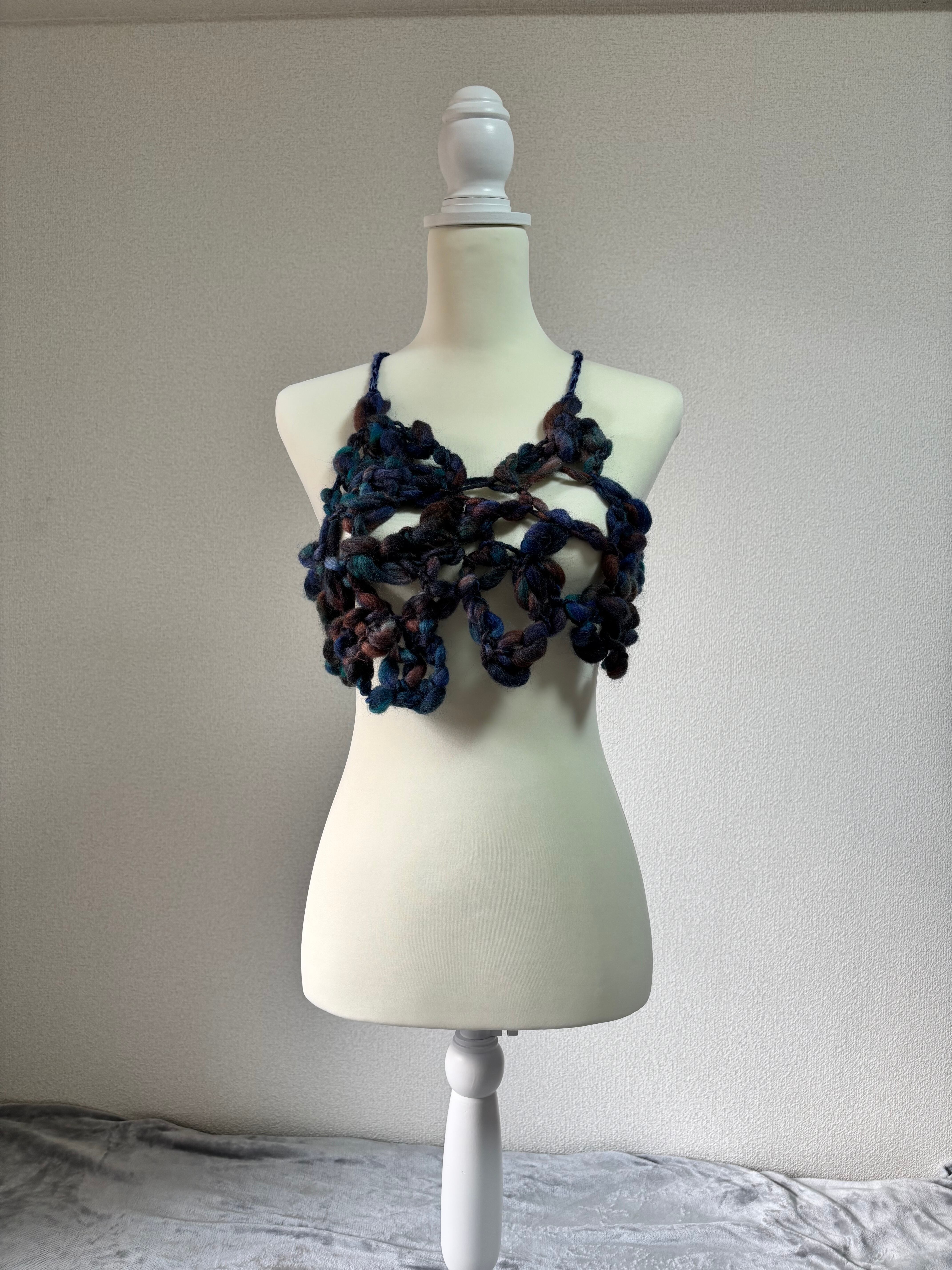 太さがバラバラの毛糸で編んだ、ちょっと不思議なデザインが可愛いビスチェ。