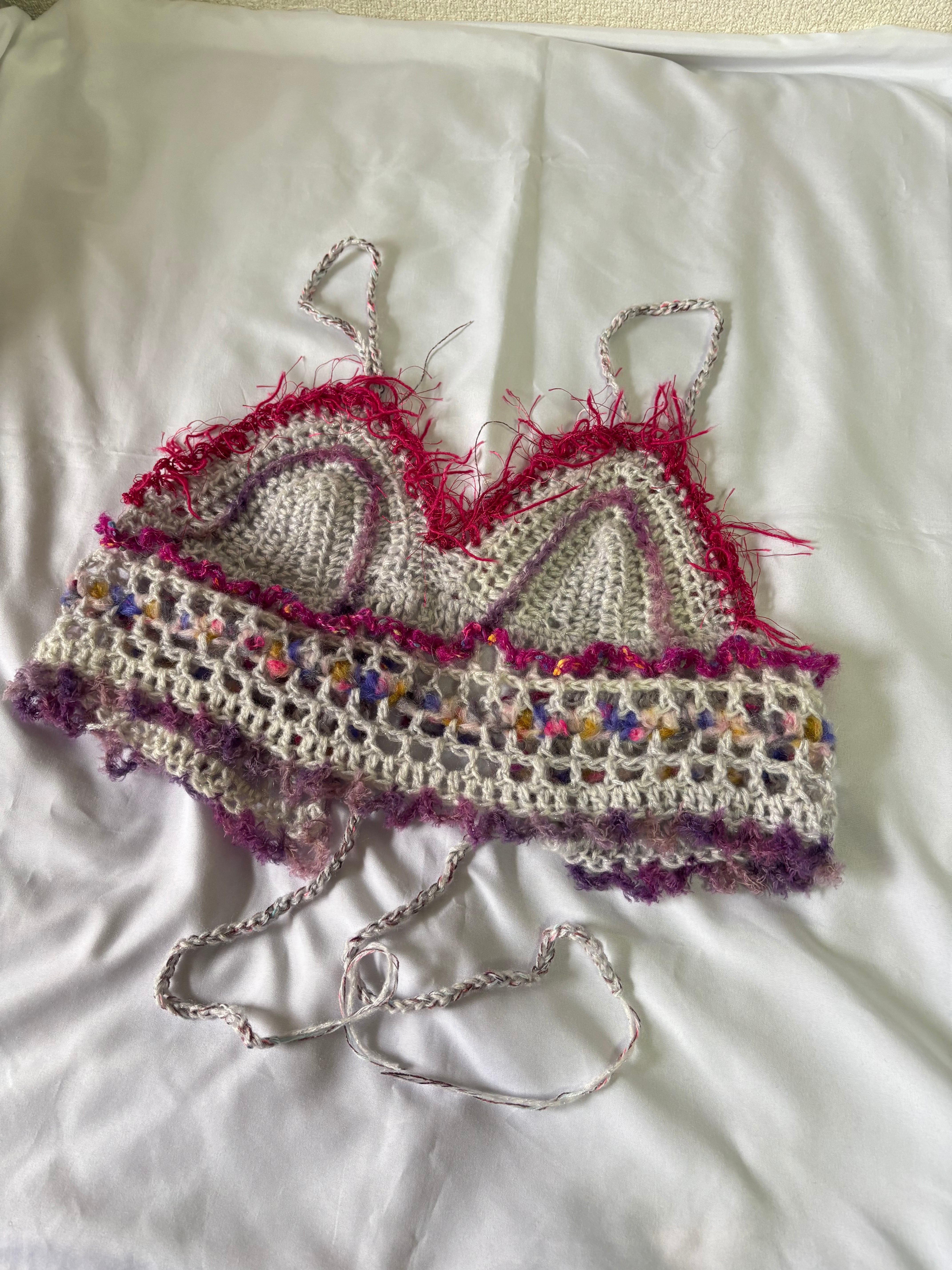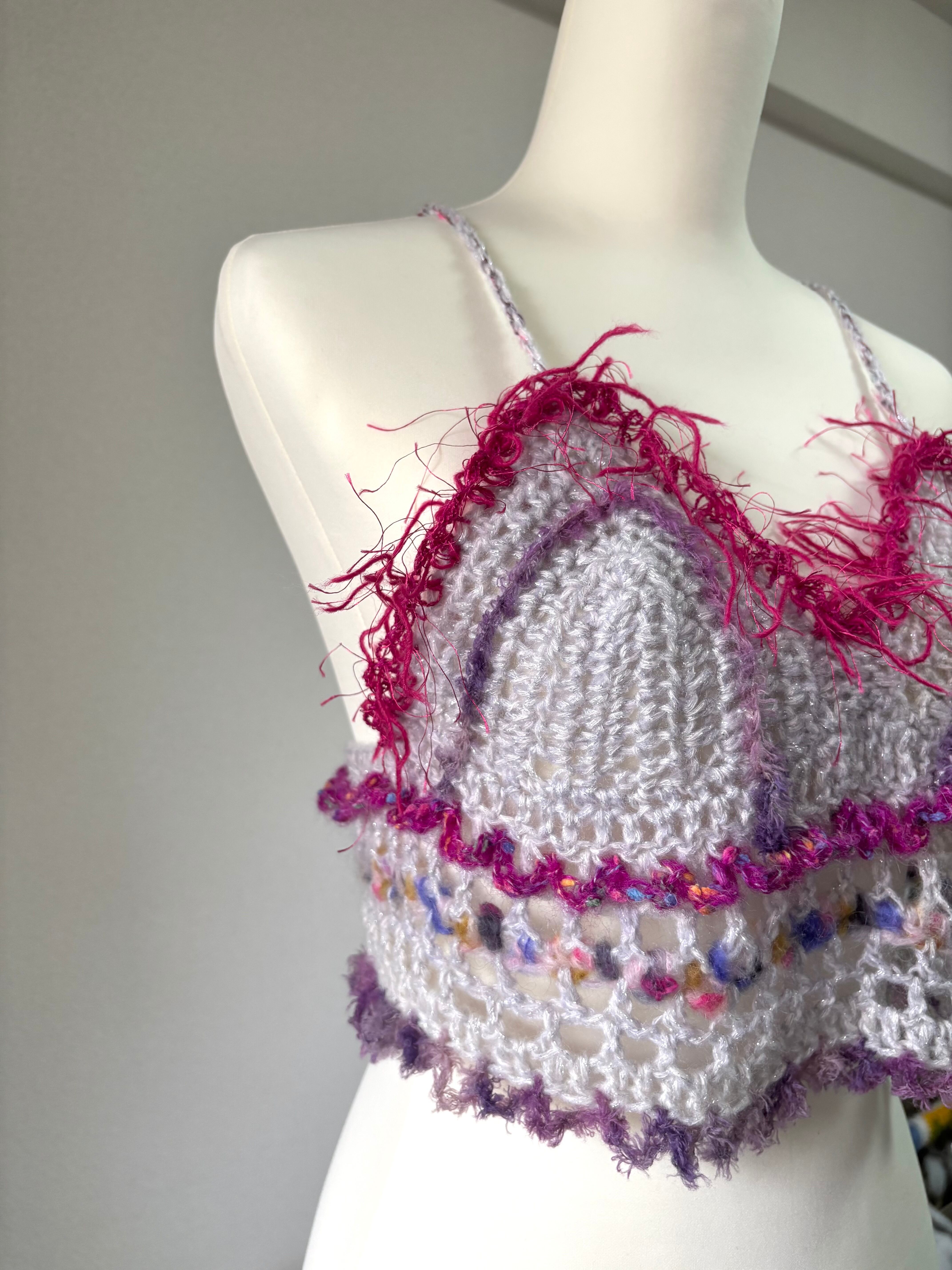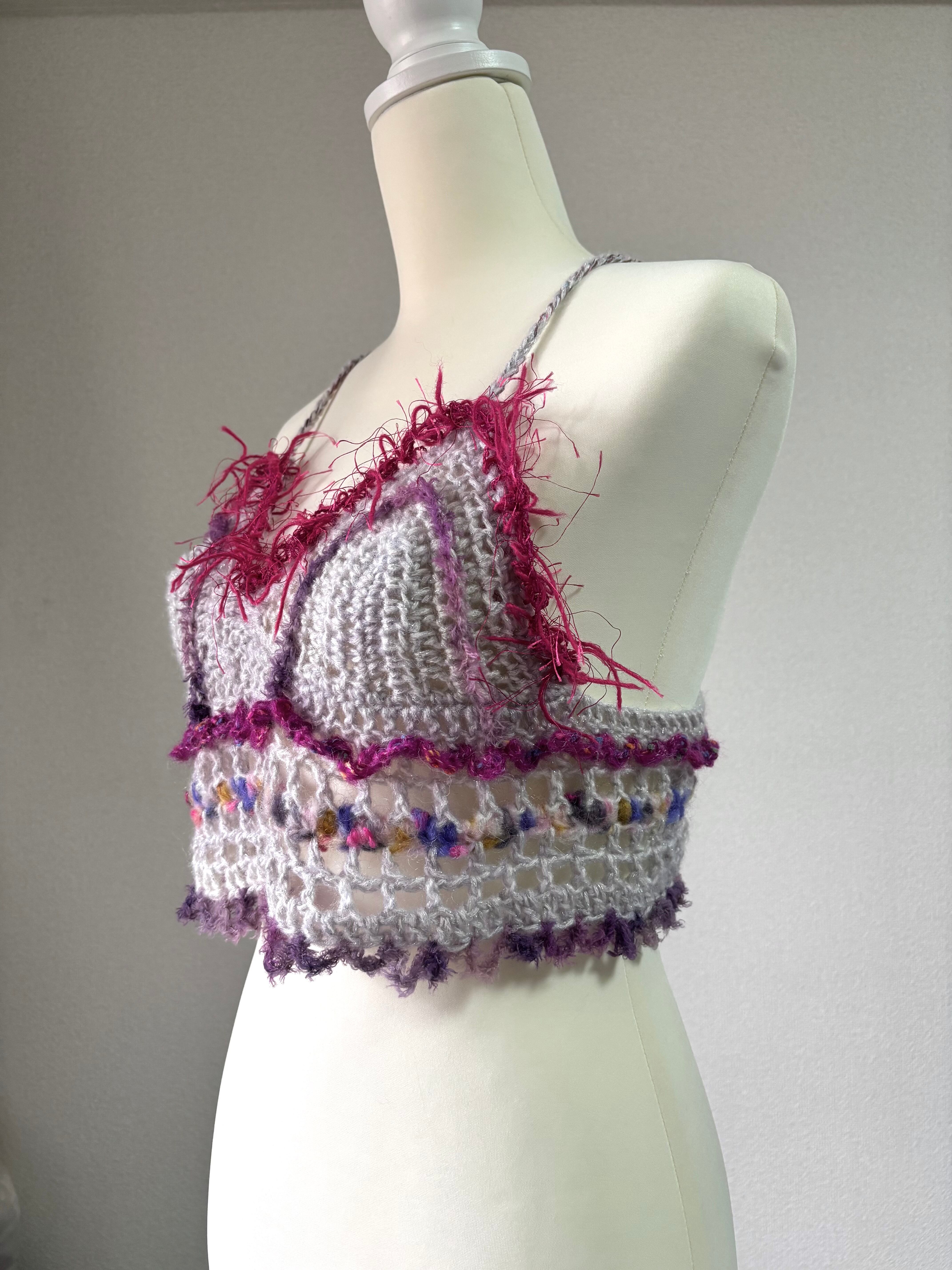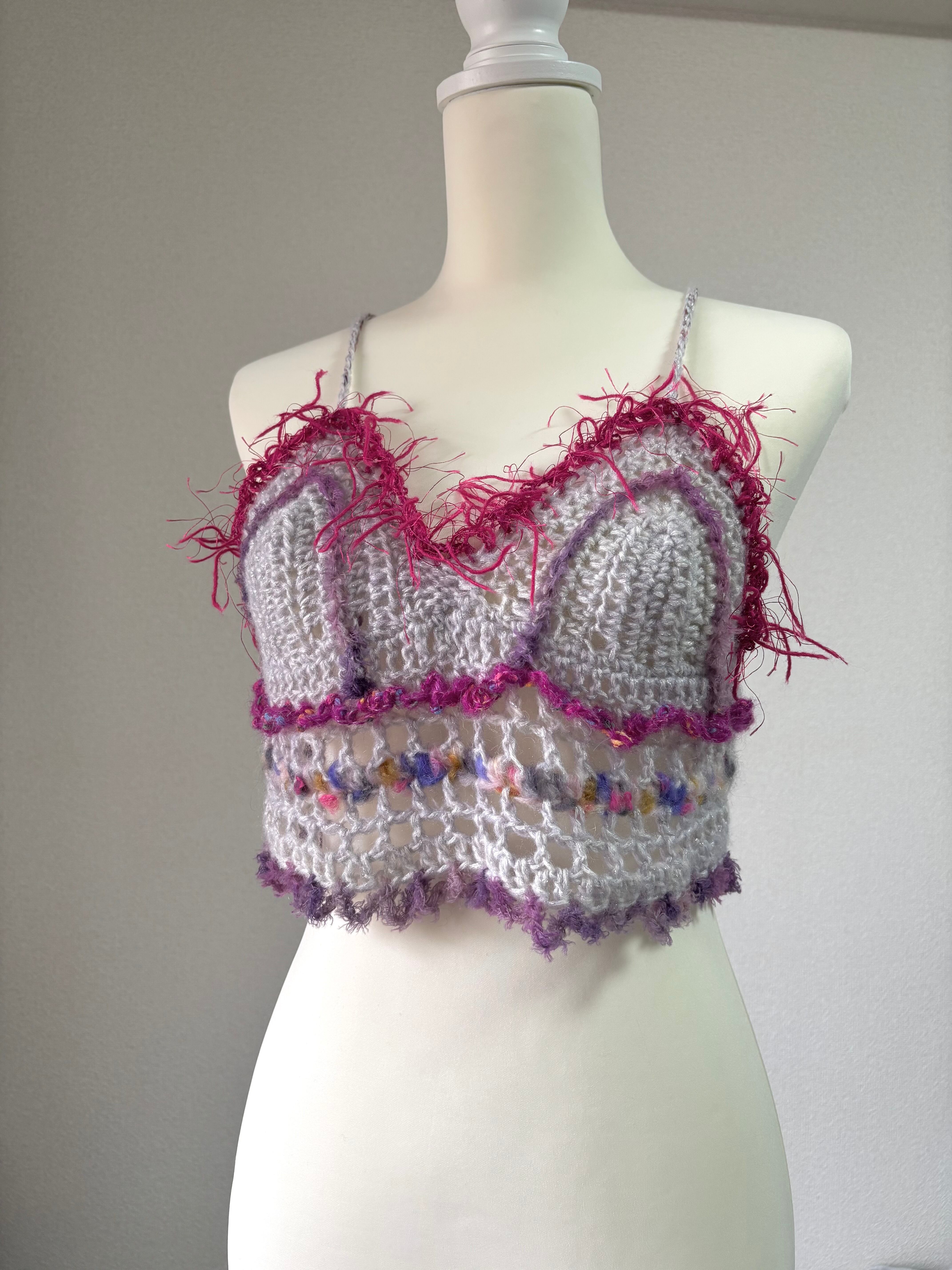 ビビットピンクのもじゃもじゃが印象的なビスチェ。