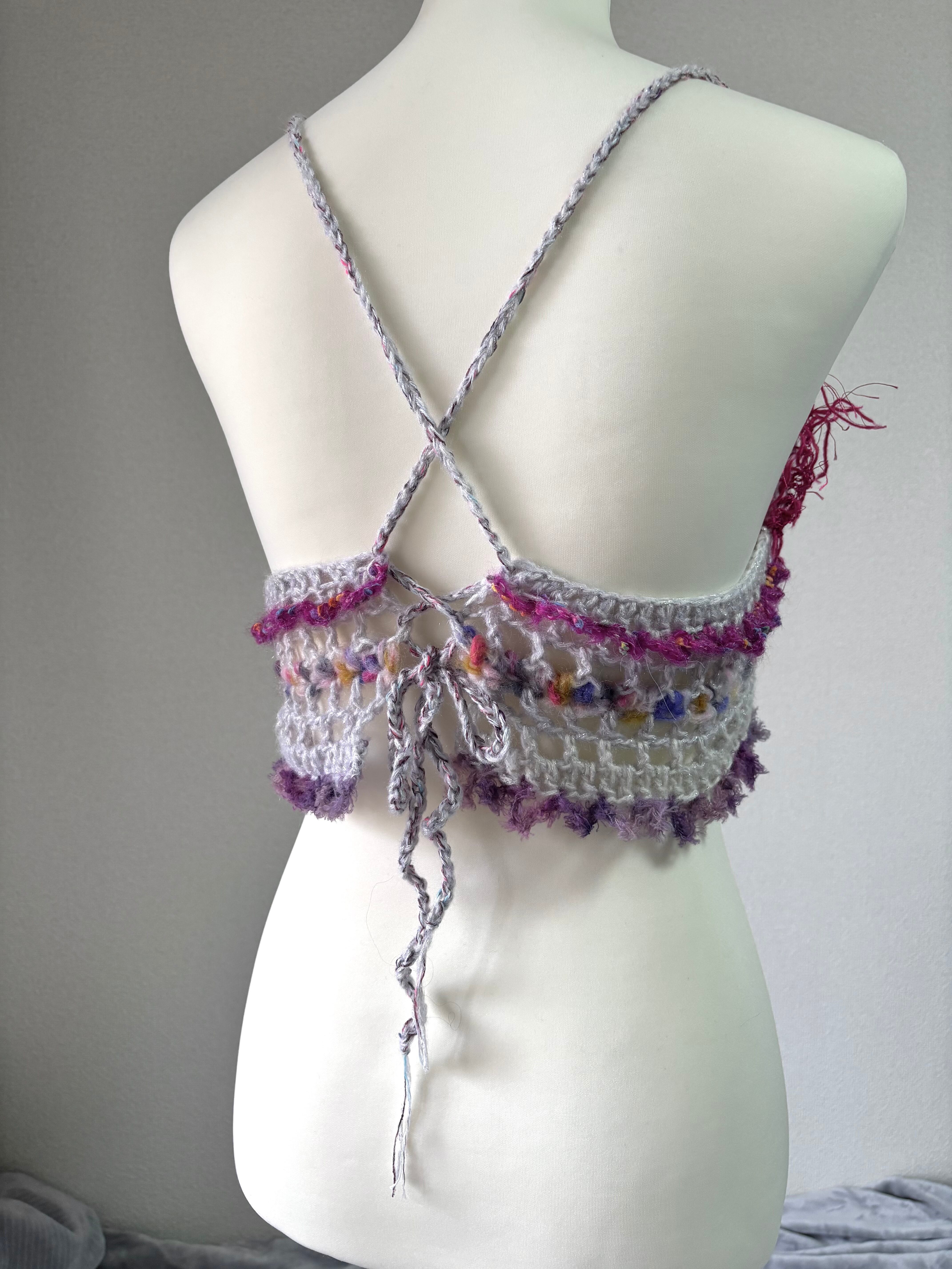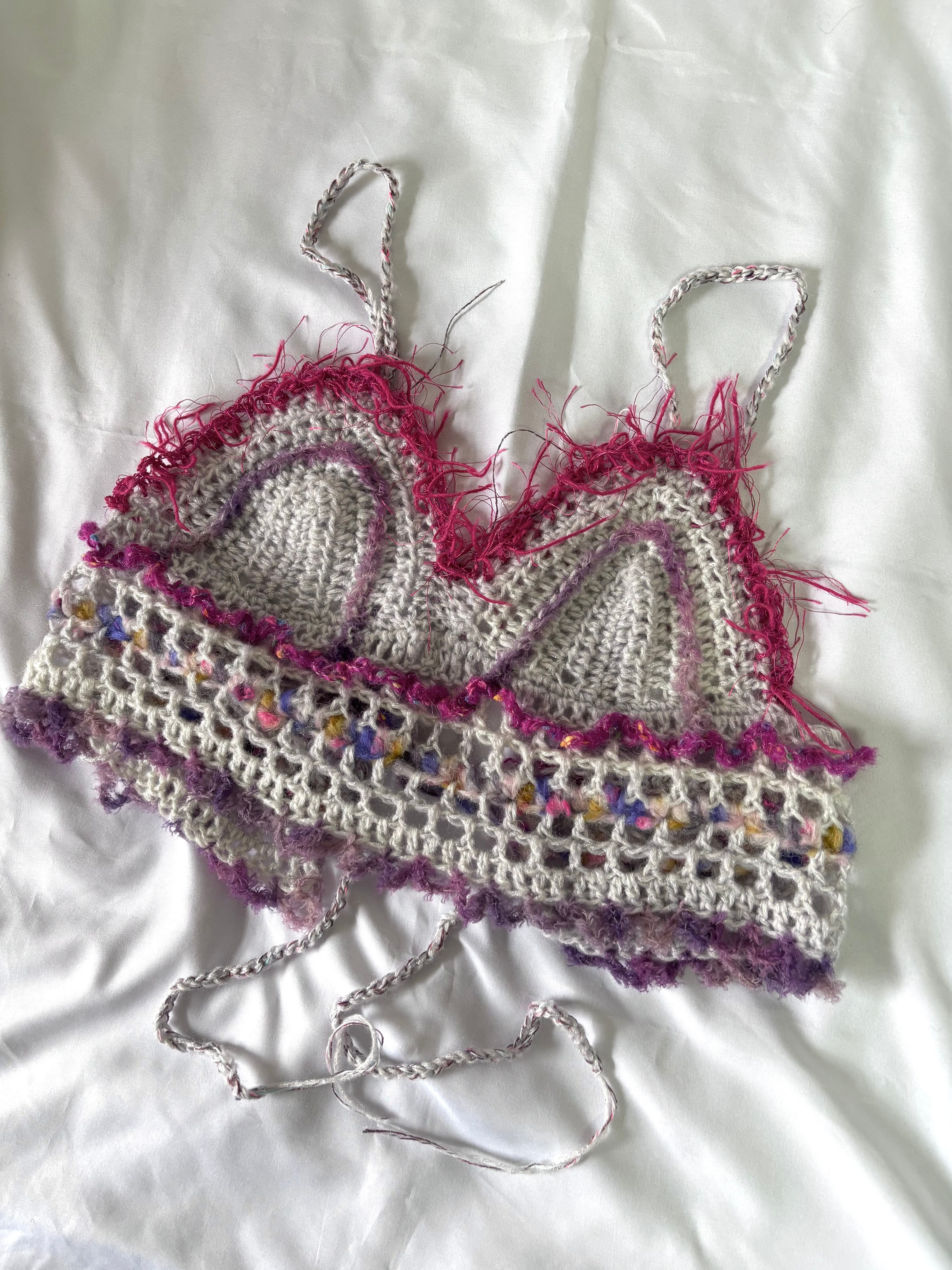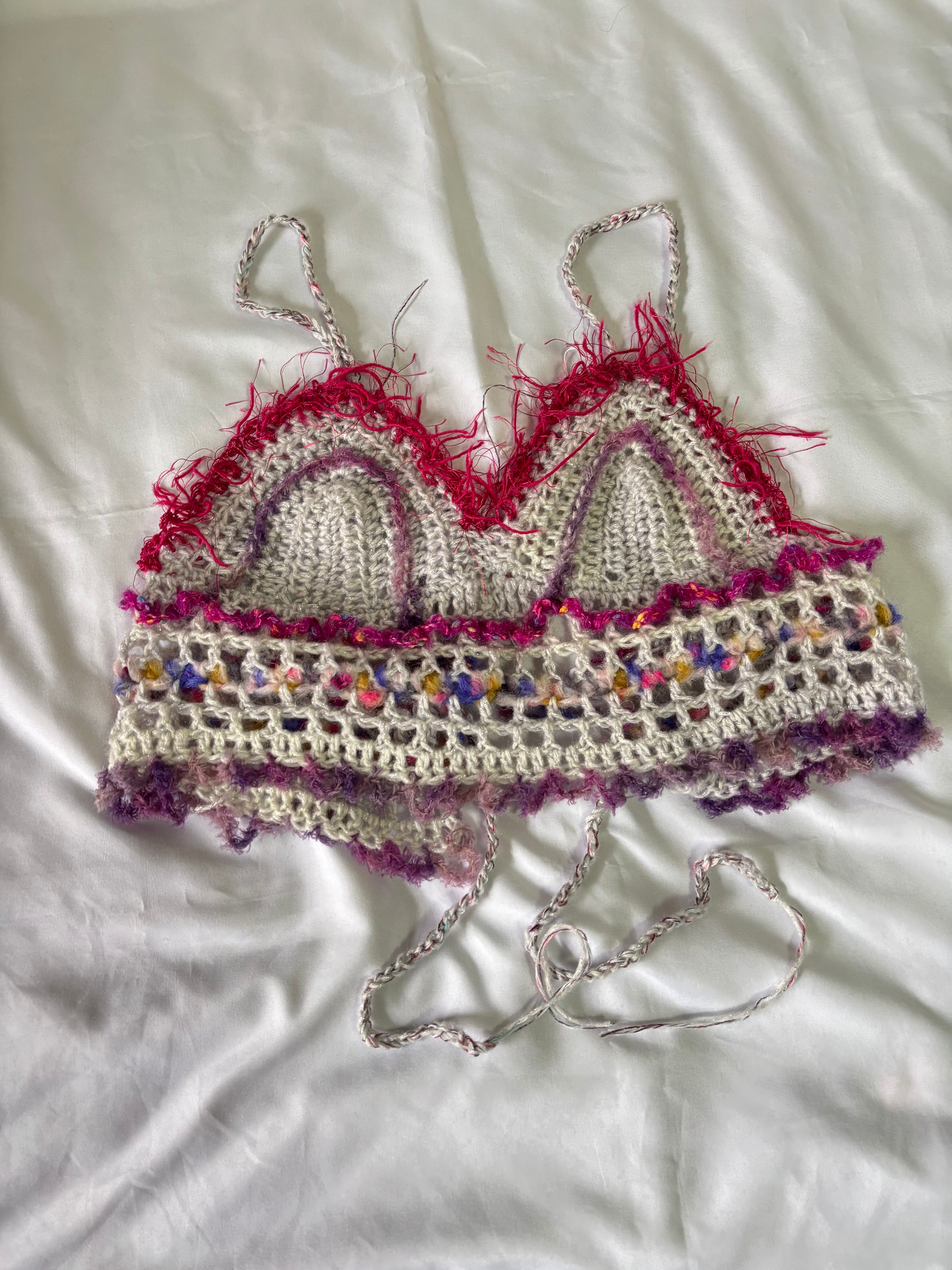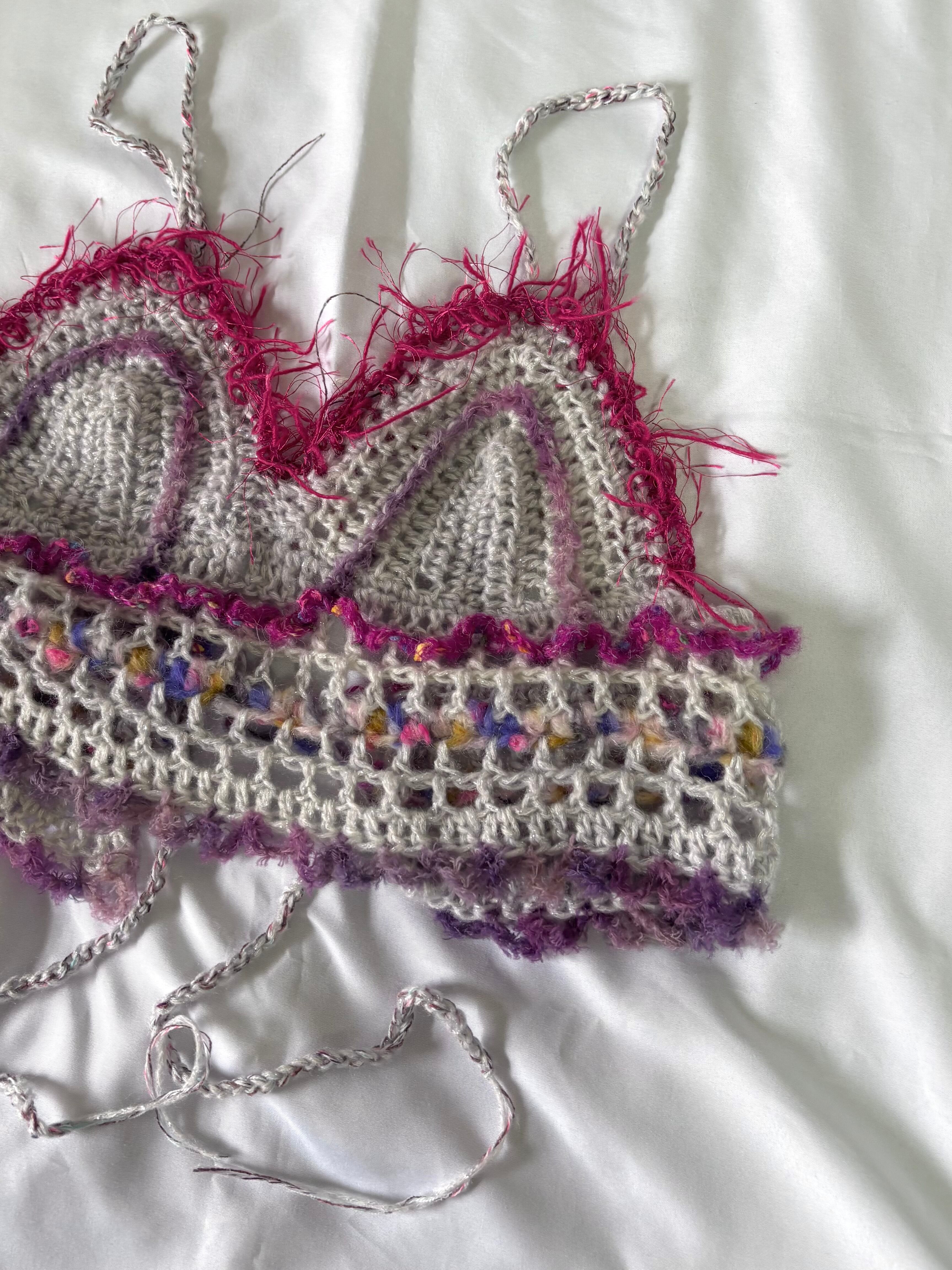 ビビットピンクのもじゃもじゃが印象的なビスチェ。