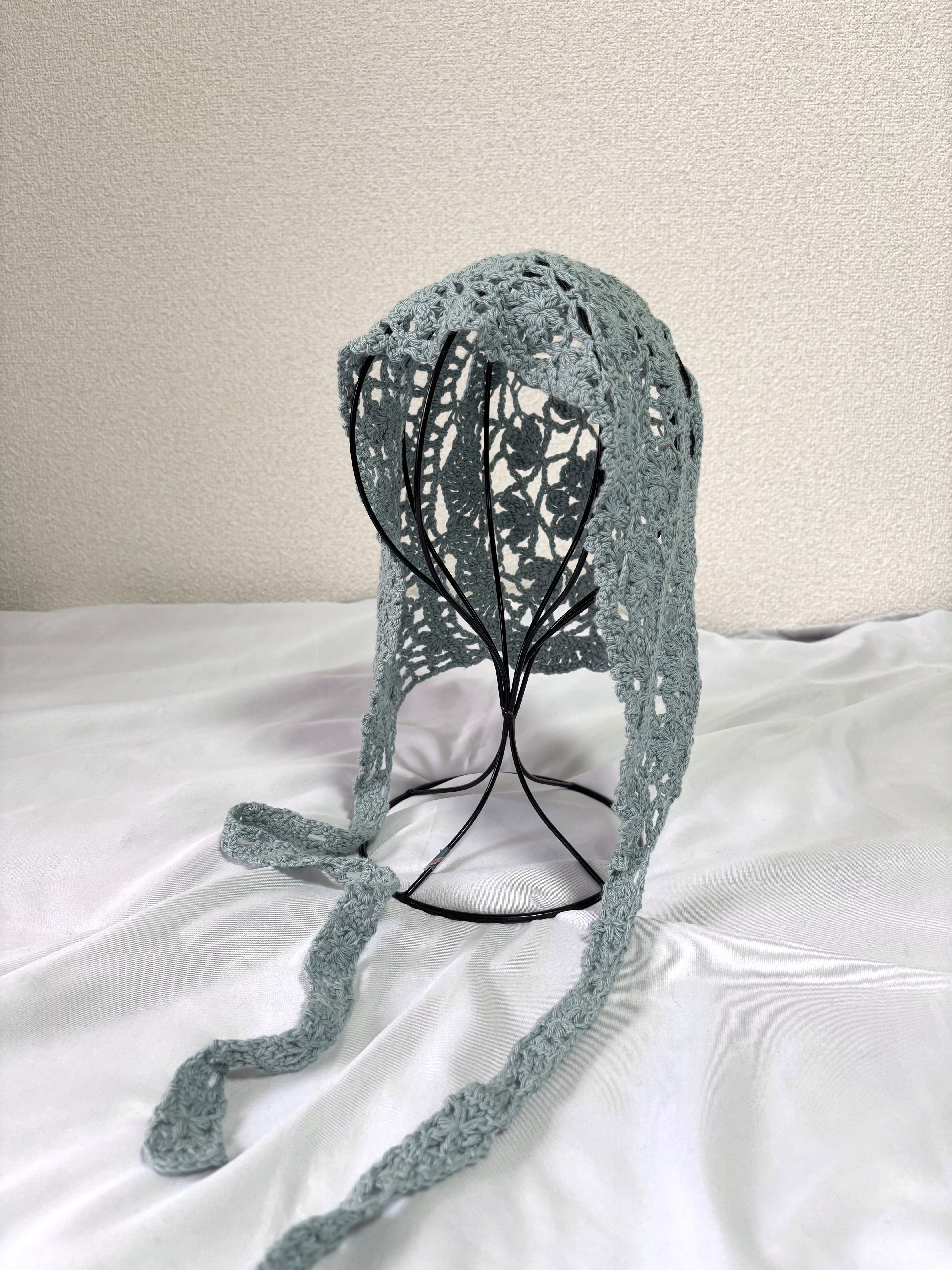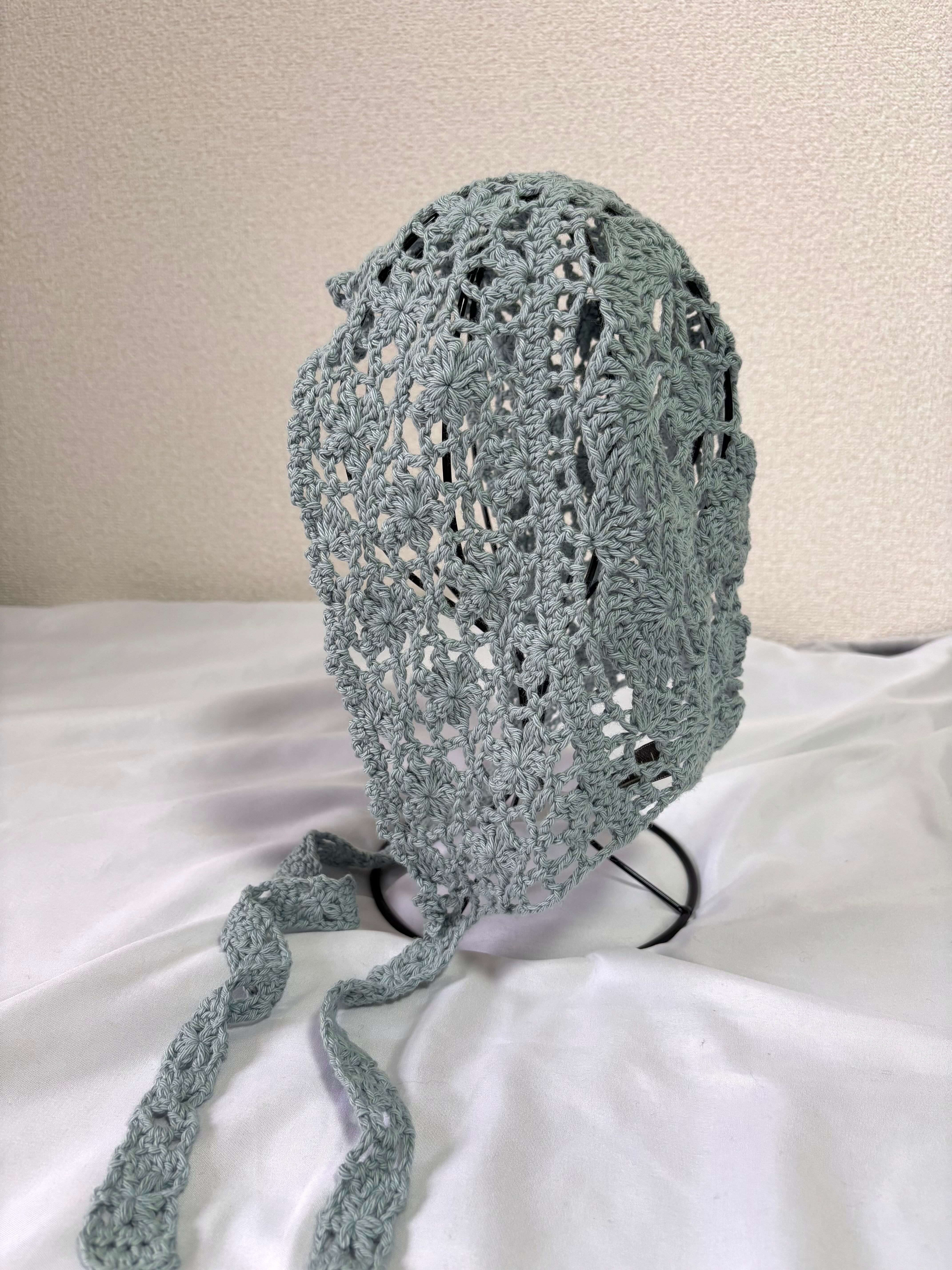 透かし編みのお花柄が可愛いボンネット。