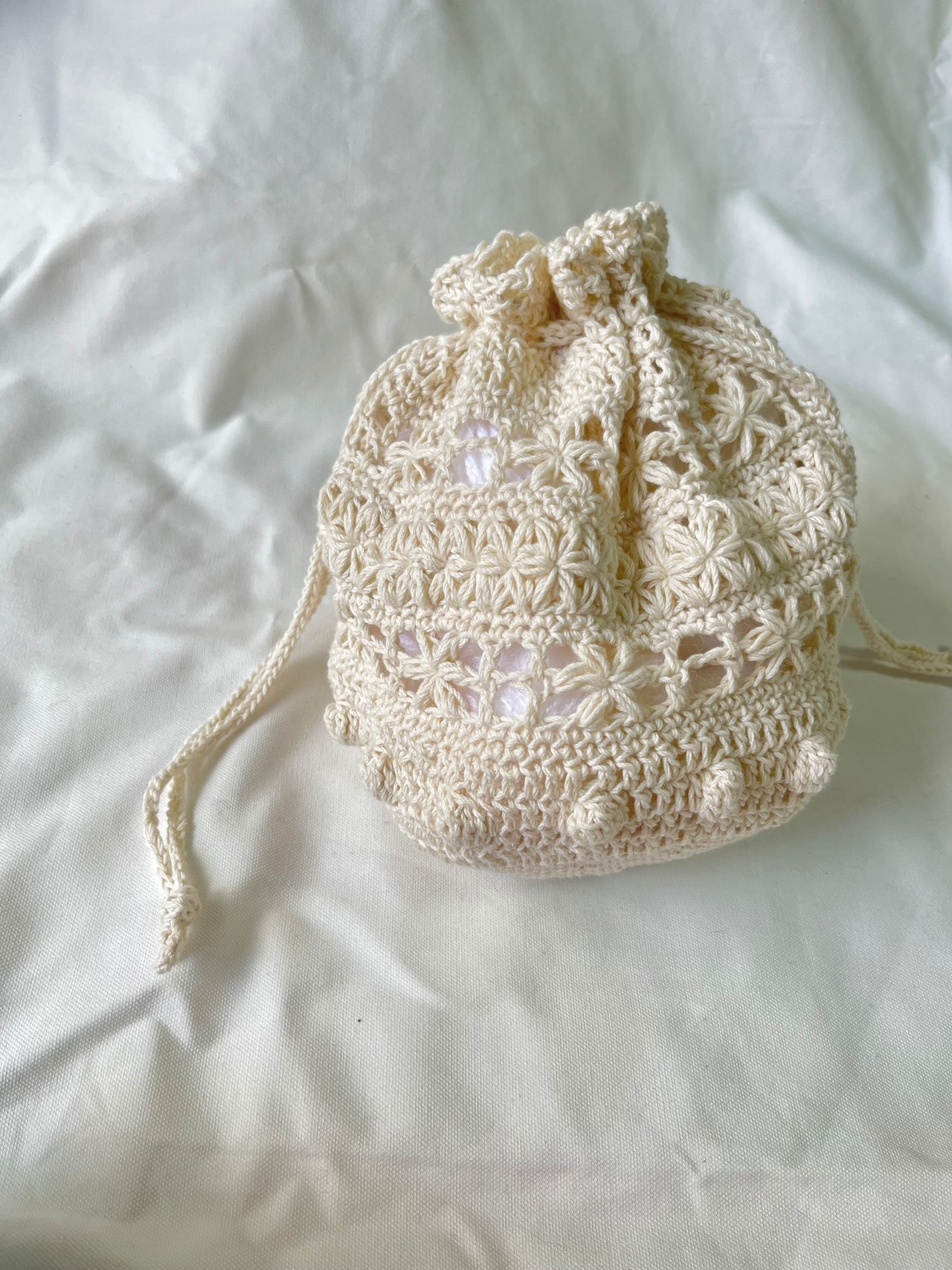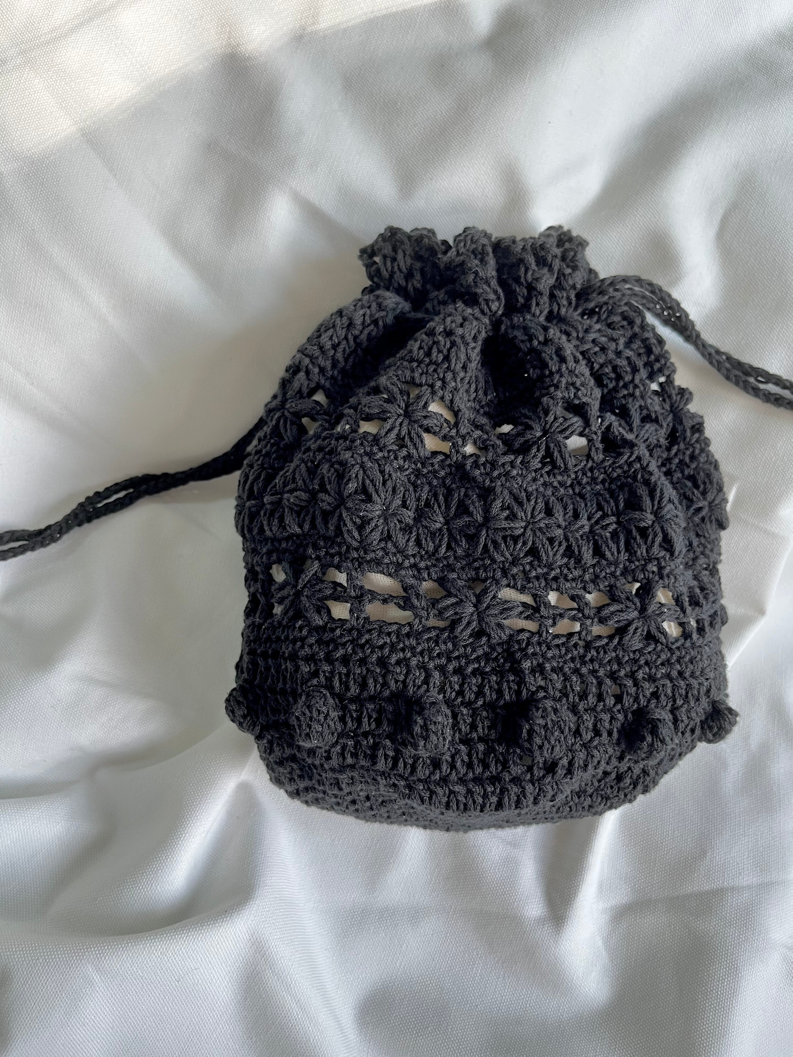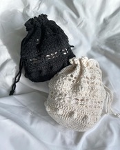 花のような2種類の模様の透かし編みが目を惹く巾着バッグ。